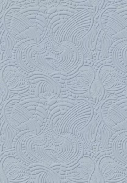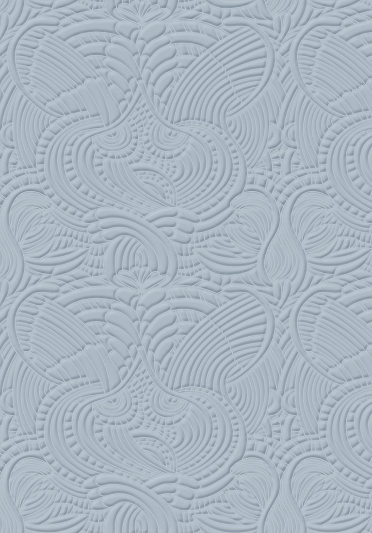 Eine 3D-Wandbekleidung in zarter Wildleder-Optik, inspiriert von der naturgetreuen Tracht des Dodo Pavone: Ein weiches, silbernes Federkleid mit verschiedenen Nuancen in Grau, Blau, Beige und Weiß.