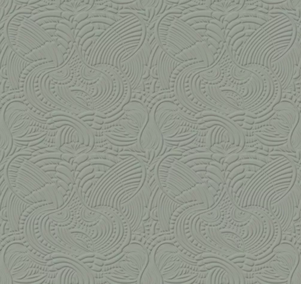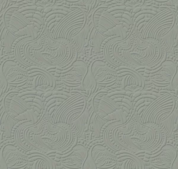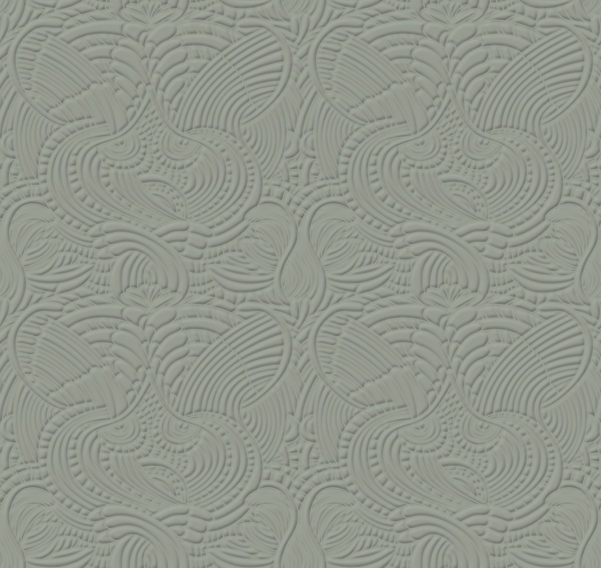 Eine 3D-Wandbekleidung in zarter Wildleder-Optik, inspiriert von der naturgetreuen Tracht des Dodo Pavone: Ein weiches, silbernes Federkleid mit verschiedenen Nuancen in Grau, Blau, Beige und Weiß.