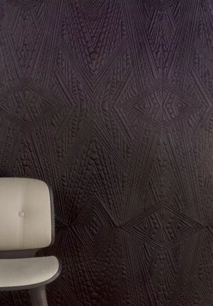 Eine 3D-Wandbekleidung, in weicher Wildleder-Optik die sich die einzigartige Struktur der fast antiken Haut und der typischen graubraunen Falten zum Beispiel nahm, und einer Rüstung glichen.