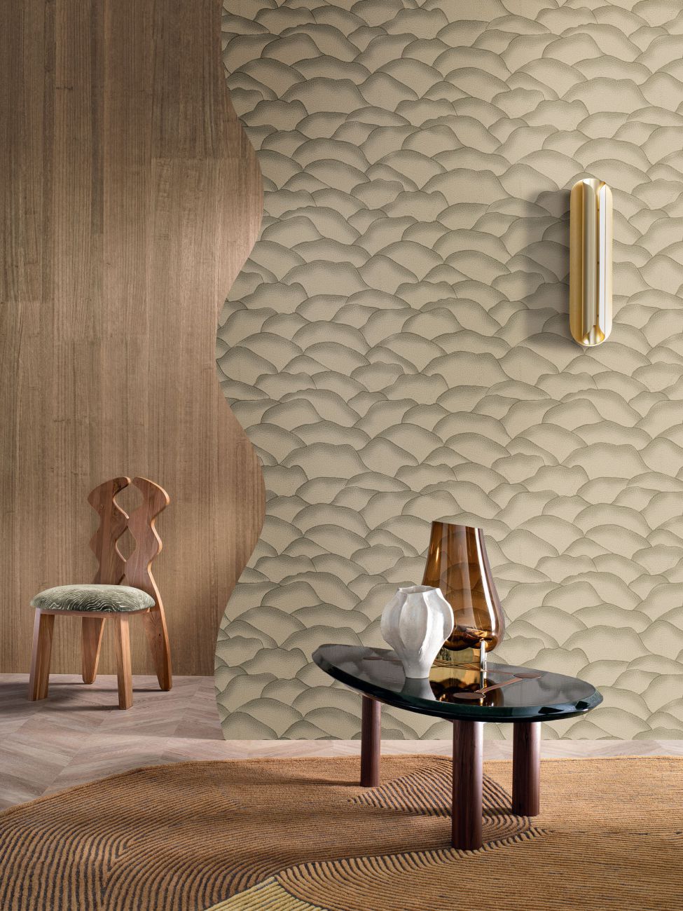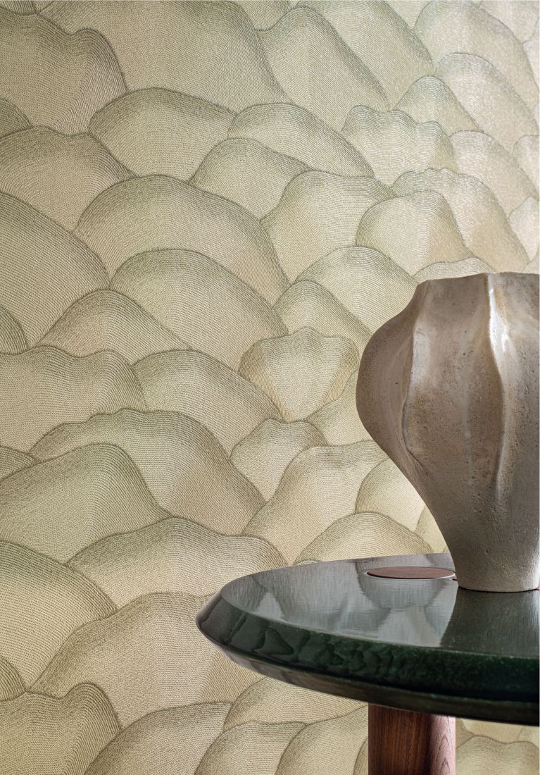 Ondula vermittelt die fließende Bewegung einer handgearbeiteten Garnapplikation. Die Struktur wird auf einer extra breiten Vinyl-Wandbekleidung durch Licht- und Schatteneffekte nachgebildet, um einen 3D-Effekt zu erzeugen. Ondula ist in sechs neutralen und zeitlosen Farbtönen erhältlich.