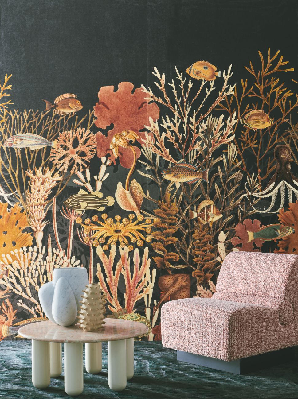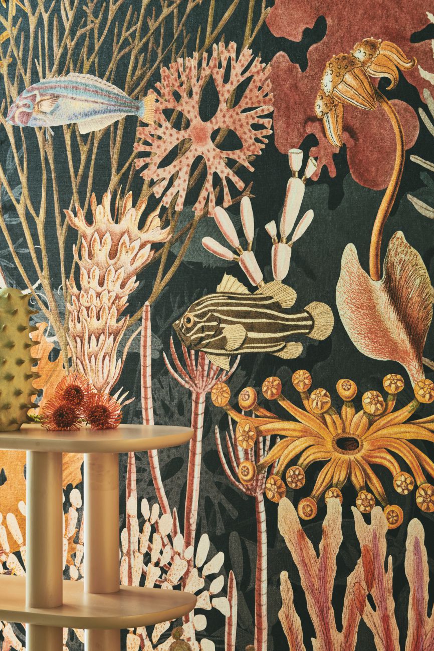 Eine kleine pazifische Insel, ein Paradies für Taucher, hat dieses fein gezeichnete Panorama inspiriert. Korallenriffe, Drückerfische, Rochen und Schmetterlingsfische sind Beweise für ihr außergewöhnliches Meeresleben. Dieses Design ist auf einem strukturierten Stoff gedruckt, der aus Polyester-Chenille hergestellt wird. Sein schillernder Look zeigt die gesamte Tiefe der abgestuften Farben.