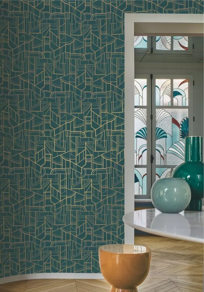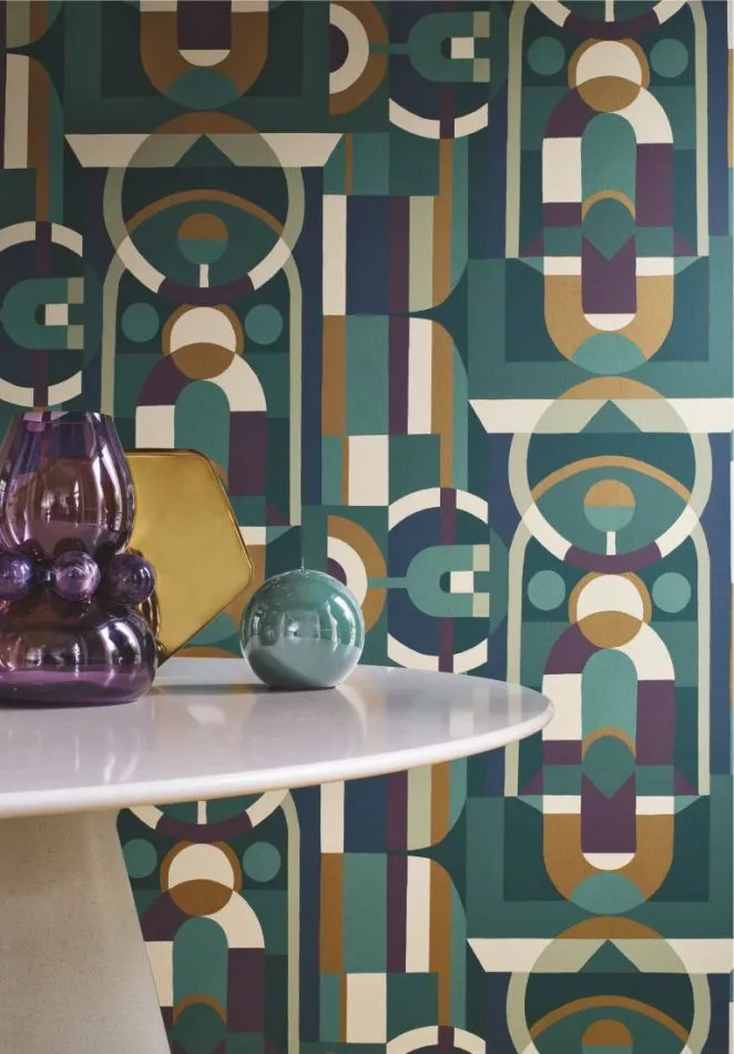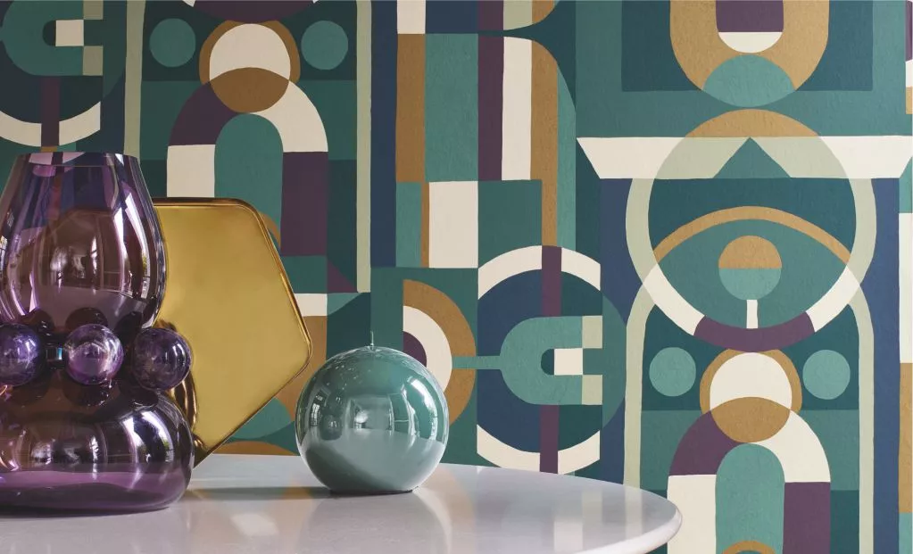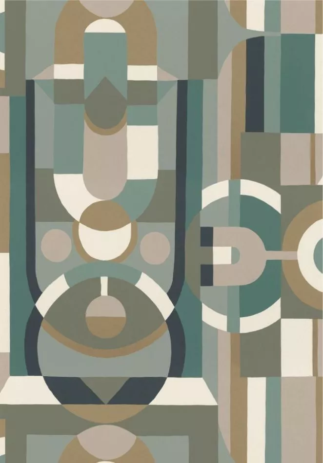 In einer Palette von tiefen Tönen zeigt sie elegante geometrische Kompositionen, die von der Architektur und den Buntglasfenstern der Dreißigerjahre beeinflusst sind.