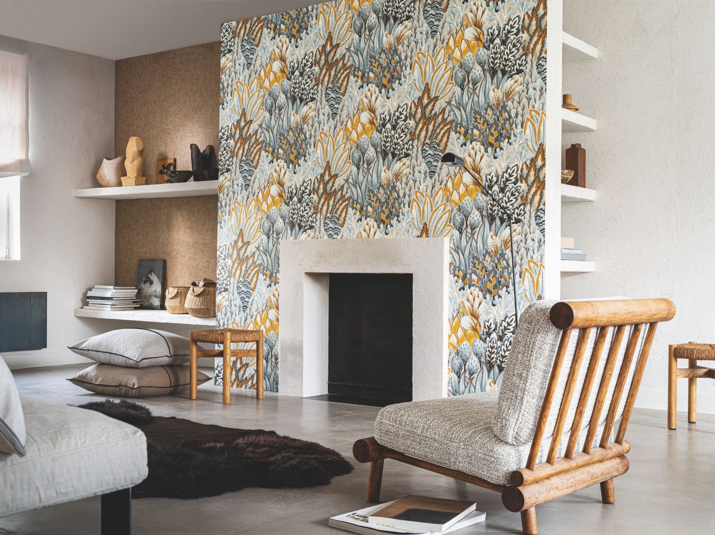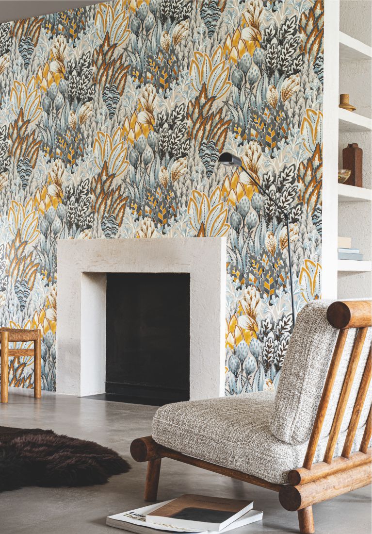 Üppige Vegetation in satten Farben erwacht an den Wänden zum Leben. Die satten Farben werden mit der Tiefdrucktechnik erzeugt, die sehr präzise Muster erzeugt. Avicennia passt zum Stoff „Kirsten Garden“. Die Avicennia, auch schwarze Mangrove genannt, ist ein kleiner Baum, der in tropischen Mangroven vorkommt.