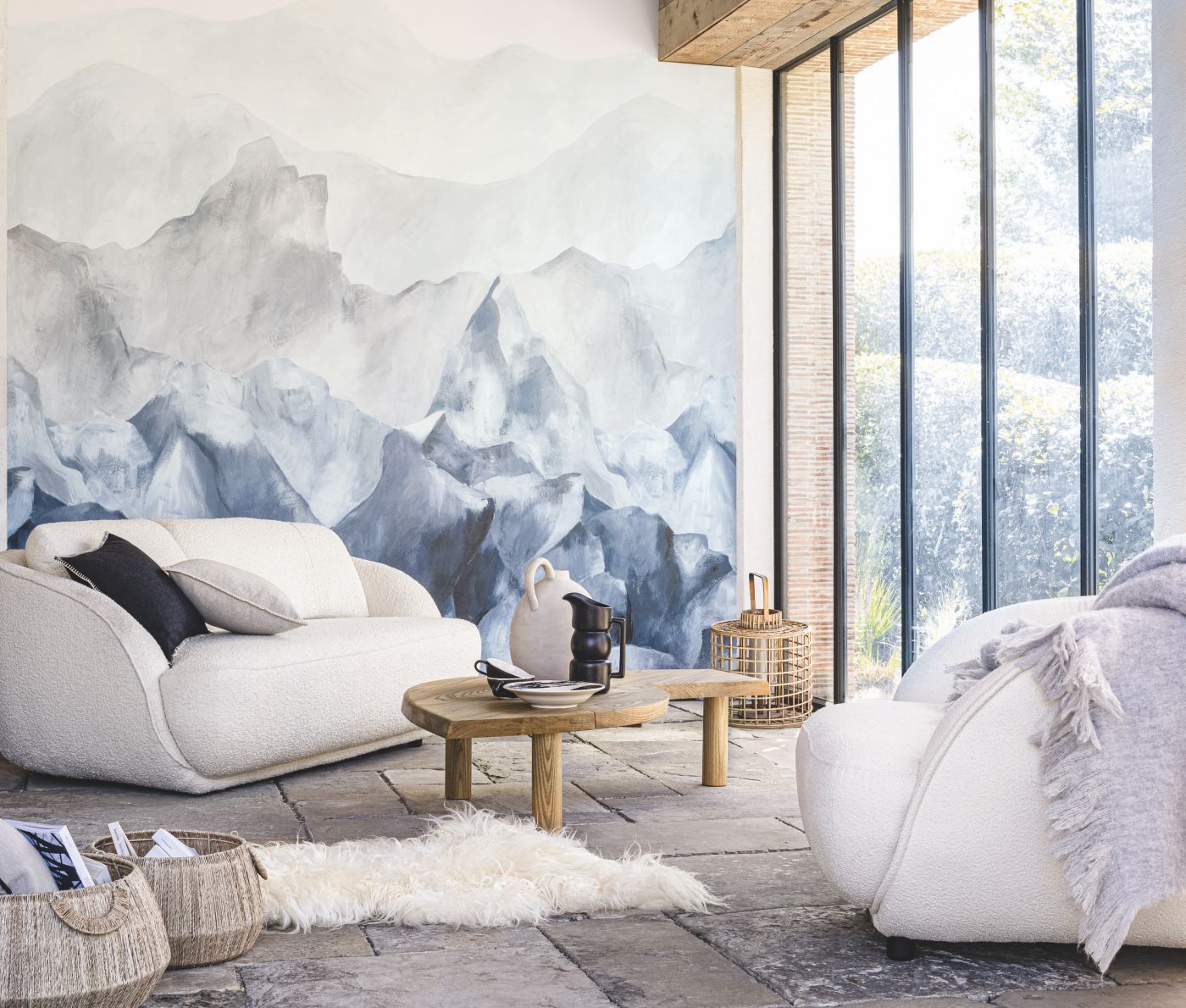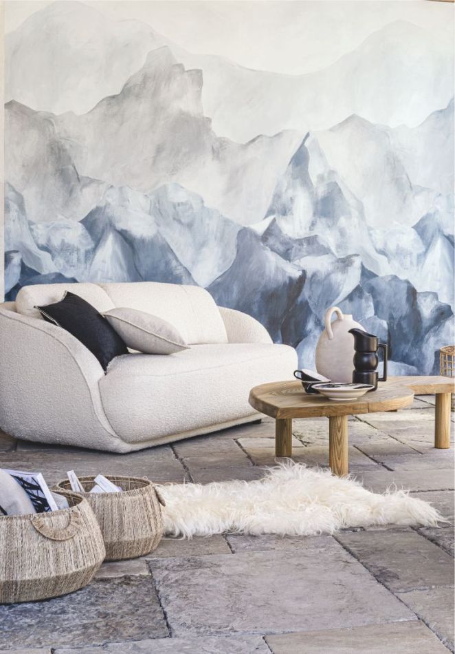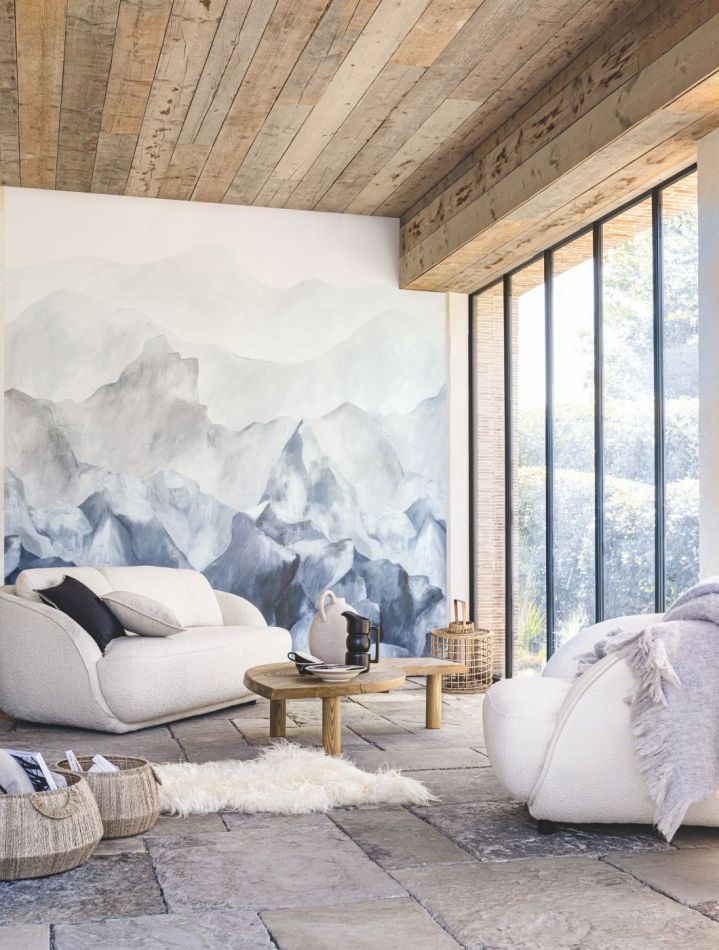 Die Everest-Wandplatte scheint aus dem Nebel geformt zu sein. Mit zarten Mineralfarben nehmen die Berge Gestalt an. Die Wände zeigen die Schönheit der Natur ohne Erfindungen und bringen uns ein tiefes Gefühl der Ruhe. Diese Landschaft wurde von einem unserer Stylisten vollständig von Hand gezeichnet.