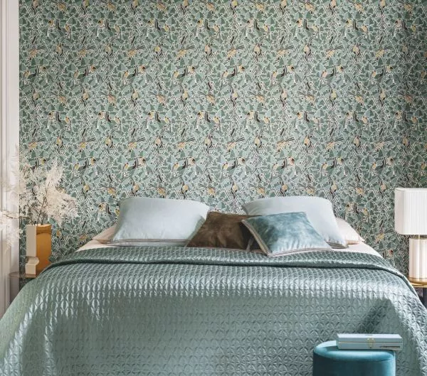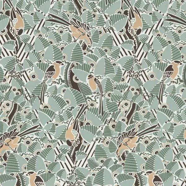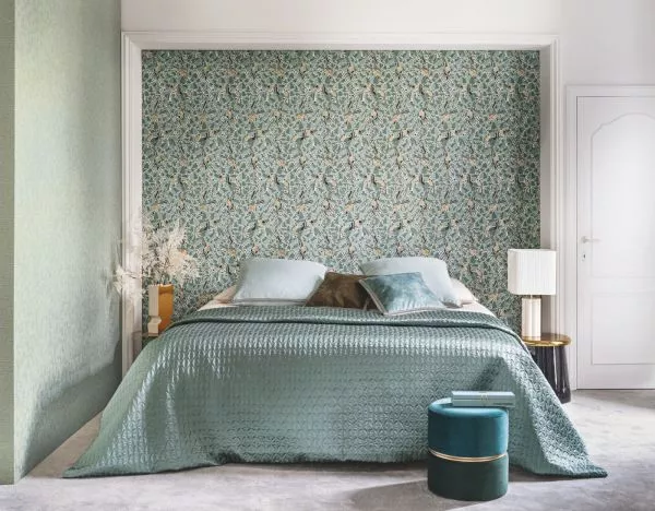 Das Majolikahaus und seine Blumenfassade haben auf dieser Tapete Spuren hinterlassen. Das Majoliques-Design erinnert an den Wiener Secessionsstil. Das Design und die Geometrie sind harmonisch. Ein Wirbel der Vegetation, bei dem die mattschwarze Tinte stilisierte Vögel zur Geltung bringt und die metallische Tinte die Helligkeit der kleinen Blüten erhöht. Dieses Hauptdesign wurde unter Verwendung von 5 Filmen erstellt, darunter einer in Körnung (mattschwarze Sandtinte) für den Hintergrund, und für bestimmte Details wird eine Metallic-Tinte verwendet, deren Platzierung von einer Farbe zur nächsten variiert. In 5 Farbvarianten erhältlich
