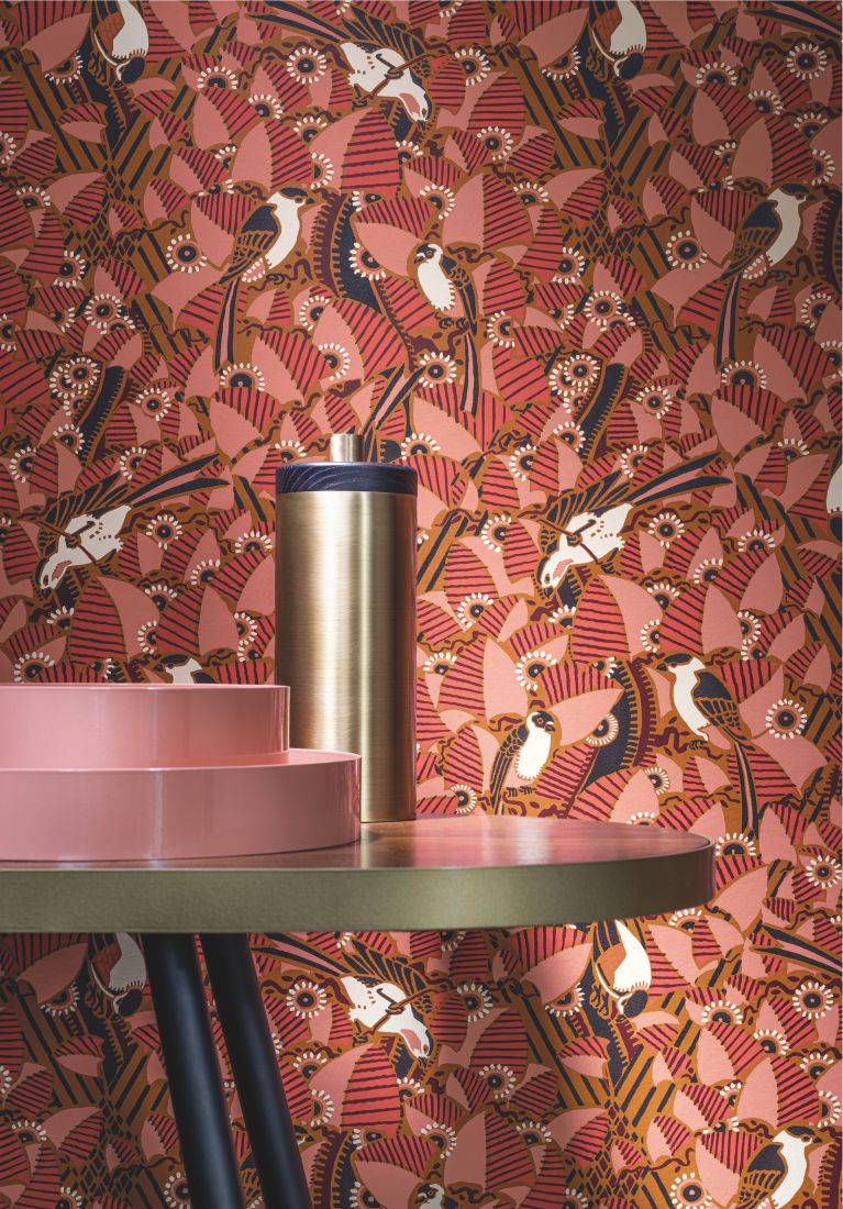 Das Majolikahaus und seine Blumenfassade haben auf dieser Tapete Spuren hinterlassen. Das Majoliques-Design erinnert an den Wiener Secessionsstil. Das Design und die Geometrie sind harmonisch. Ein Wirbel der Vegetation, bei dem die mattschwarze Tinte stilisierte Vögel zur Geltung bringt und die metallische Tinte die Helligkeit der kleinen Blüten erhöht. Dieses Hauptdesign wurde unter Verwendung von 5 Filmen erstellt, darunter einer in Körnung (mattschwarze Sandtinte) für den Hintergrund, und für bestimmte Details wird eine Metallic-Tinte verwendet, deren Platzierung von einer Farbe zur nächsten variiert. In 5 Farbvarianten erhältlich
