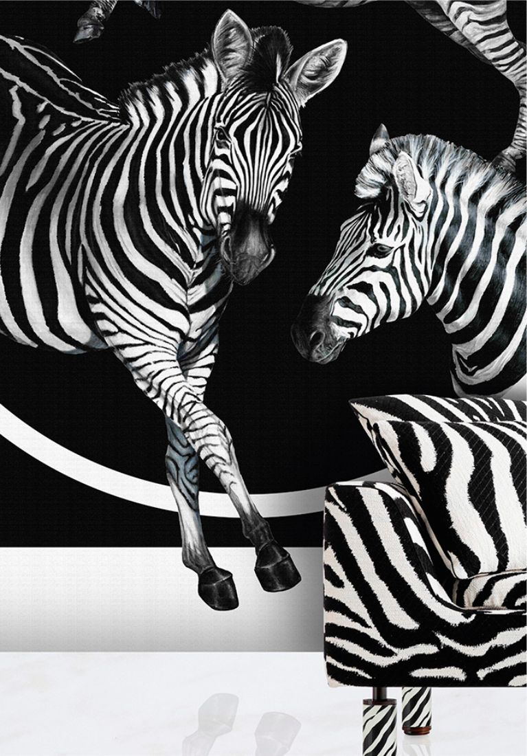 Das "Zebra Cerchio" Wandbild von Dolce & Gabbana ist ein beeindruckendes Kunstwerk, das drei Zebras in dynamischer Bewegung zeigt, die in einem Kreis angeordnet sind. Der schwarze Hintergrund verstärkt die visuelle Wirkung der Zebras, die in lebhaften Farben und detaillierten Mustern dargestellt sind.