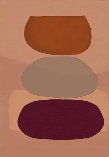 Integrierende Dessins zieren die digital gedruckten Wandbilder. Von bunten energetischen Rundungen bis hin zu optisch schwer fassbaren geometrischen Mustern und stark abstrakten Formen. Die mit kräftigen Pinselstrichen aufgetragenen Farbflächen und balancierten Steine bilden fast schon ein Gemälde an sich.