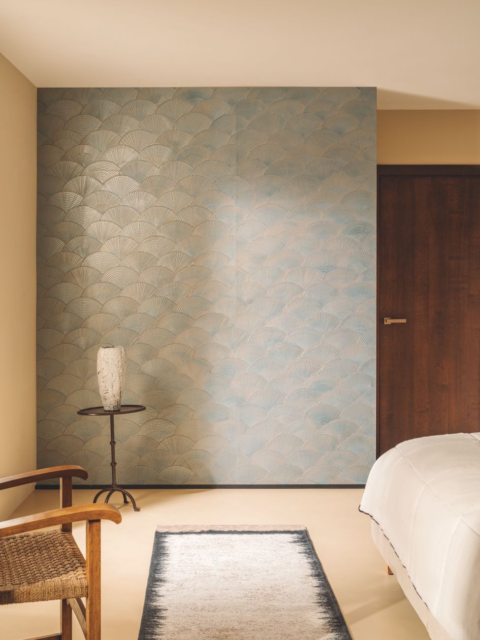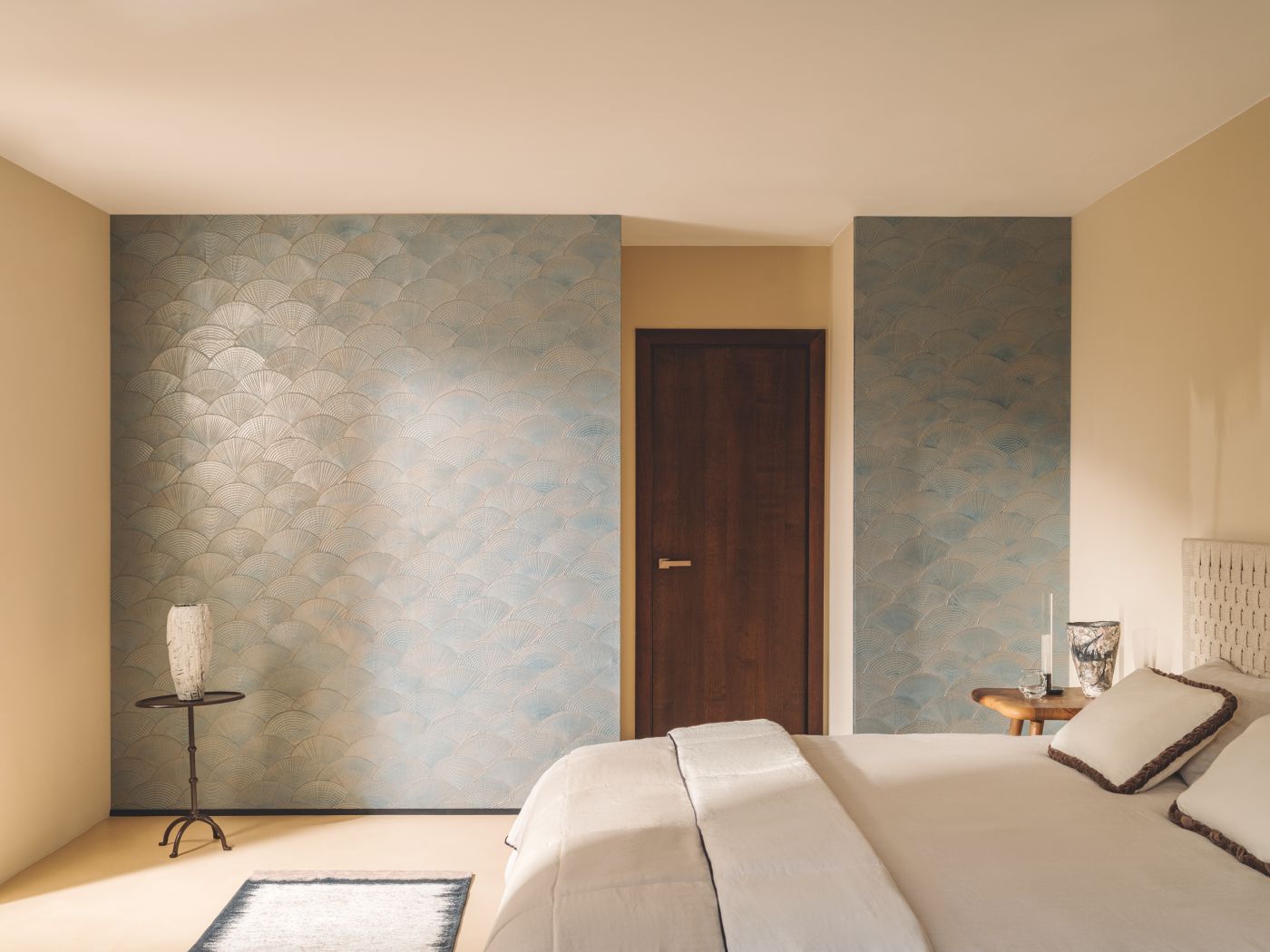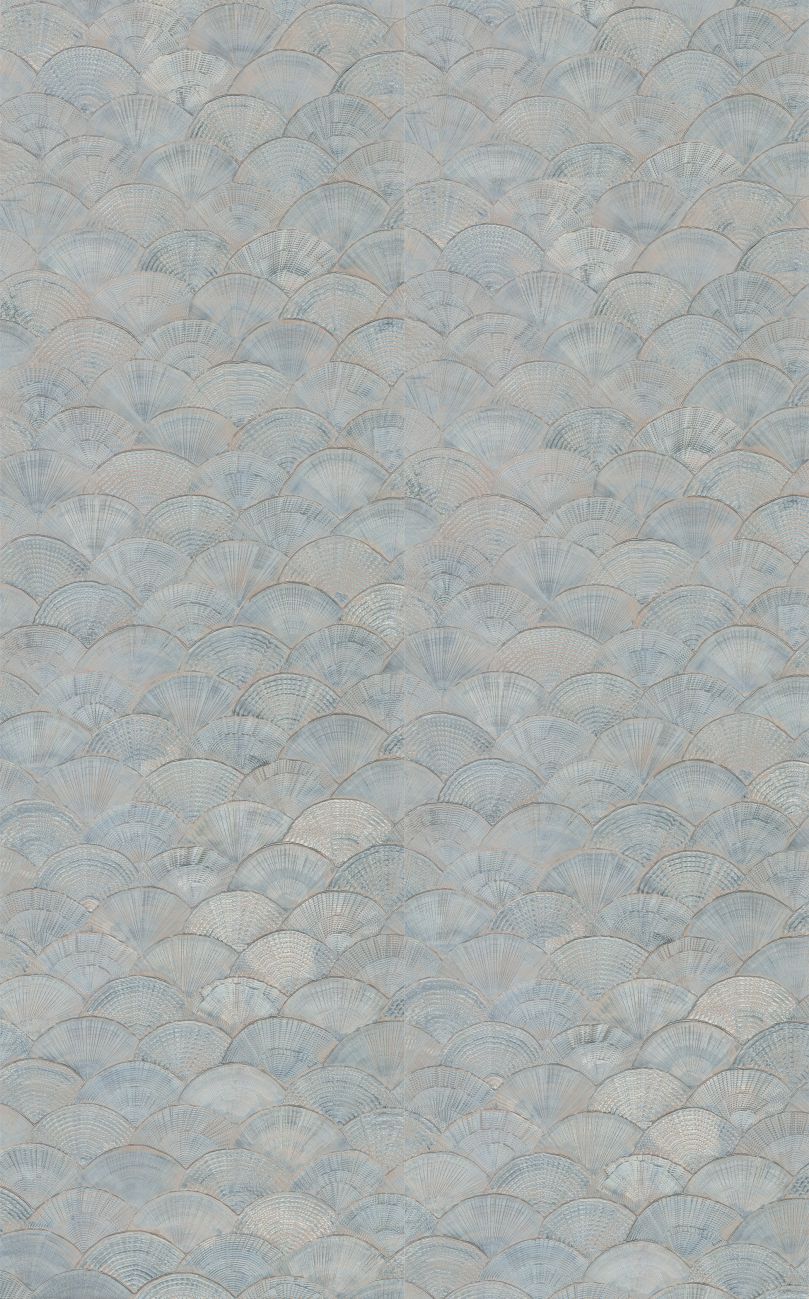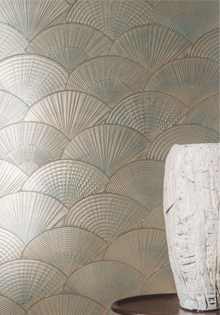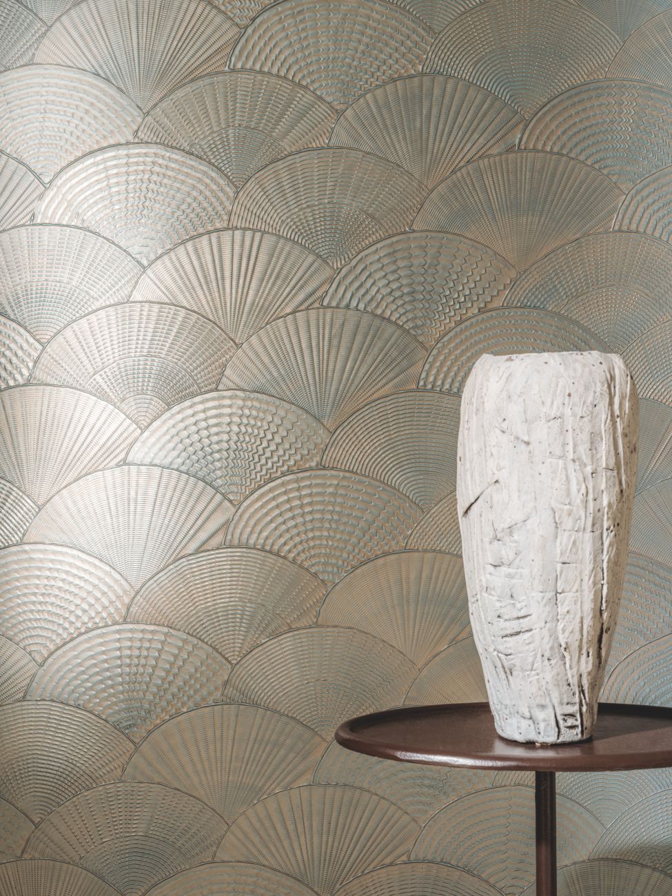 Willkommen bei einer phantastischen Expedition: Die Kollektion Écume erzählt von Tiefseegräben und ihren faszinierenden Geheimnissen. Während Lichtstrahlen bis auf den Meeresgrund reichen, schillern in der Tiefe verborgene Schätze. Eine üppige Komposition aus Gesso-Muscheln spielt mit funkelnden Lichtspiegelungen. Der verwitterte Rumpf eines U-Boots, verziert durch ein metallisches Patchwork aus Kupfer und Aluminium, berichtet von unglaublichen Fahrten durch die Weltmeere. In dieser stillen Unterwasserwelt ist sandiger Meeresgrund durch Strömungen geformt – so leuchtet ein Stoff im Perlmuttglanz, während ein Jacquard-Stoff die Wellenformen des Wassers einfängt. An der Oberfläche ragen riesige Palmen aus dem Meer und erweitern, ganz unmerklich, die träumerische Unterwasserwelt.