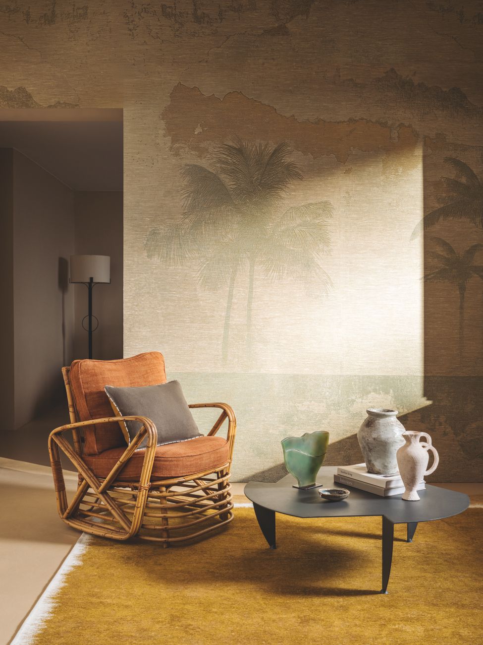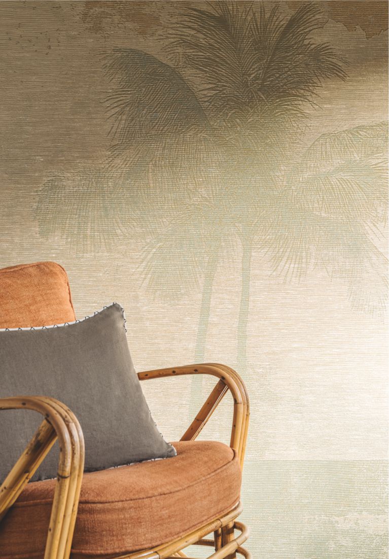 Willkommen bei einer phantastischen Expedition: Die Kollektion Écume erzählt von Tiefseegräben und ihren faszinierenden Geheimnissen. Während Lichtstrahlen bis auf den Meeresgrund reichen, schillern in der Tiefe verborgene Schätze. Eine üppige Komposition aus Gesso-Muscheln spielt mit funkelnden Lichtspiegelungen. Der verwitterte Rumpf eines U-Boots, verziert durch ein metallisches Patchwork aus Kupfer und Aluminium, berichtet von unglaublichen Fahrten durch die Weltmeere. In dieser stillen Unterwasserwelt ist sandiger Meeresgrund durch Strömungen geformt – so leuchtet ein Stoff im Perlmuttglanz, während ein Jacquard-Stoff die Wellenformen des Wassers einfängt. An der Oberfläche ragen riesige Palmen aus dem Meer und erweitern, ganz unmerklich, die träumerische Unterwasserwelt.