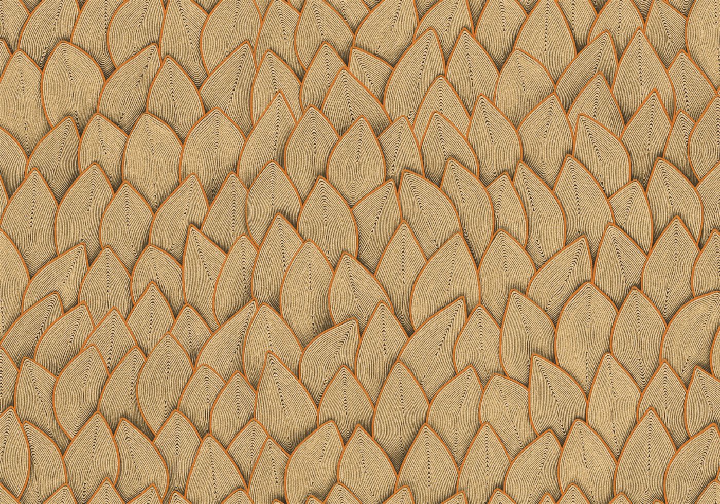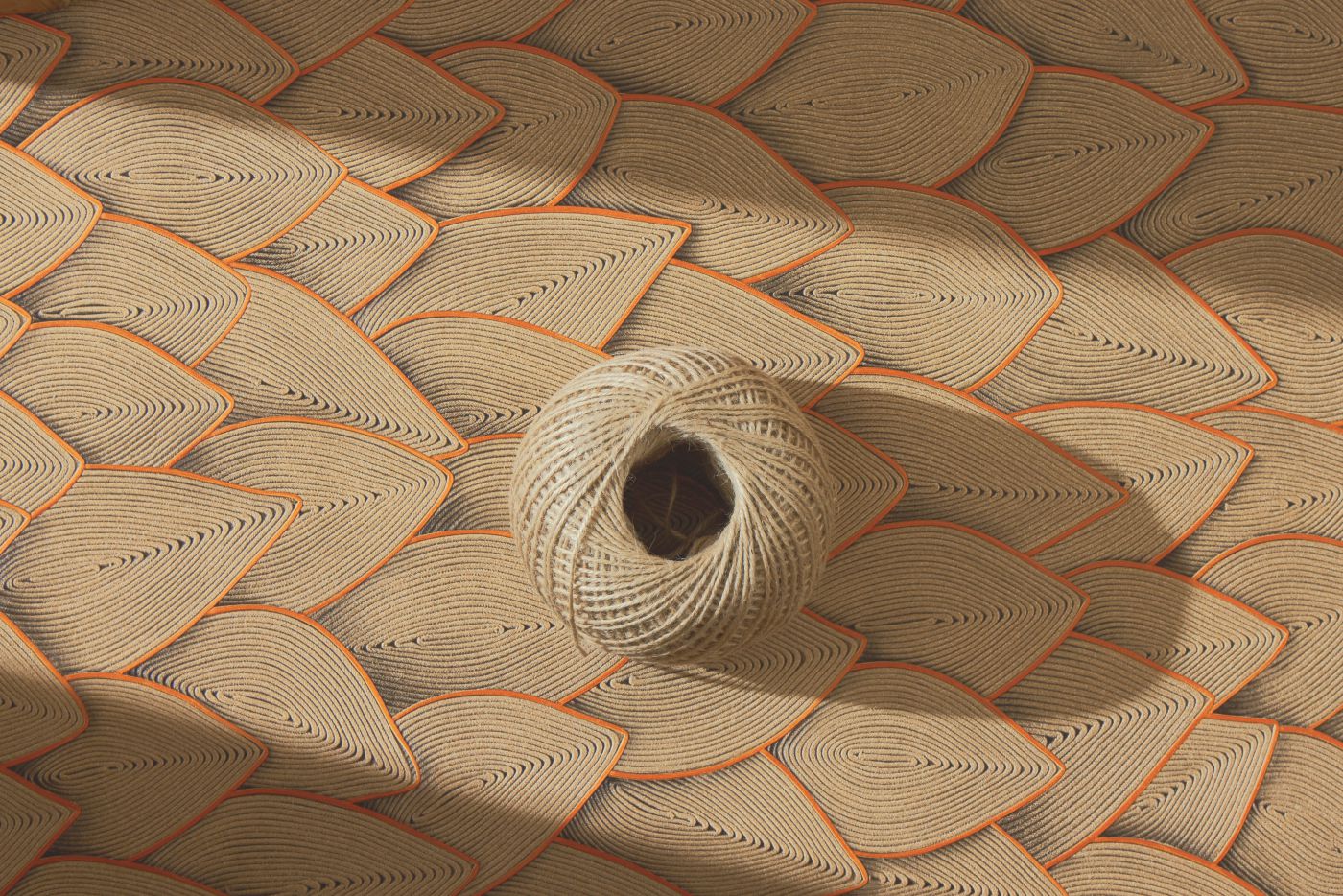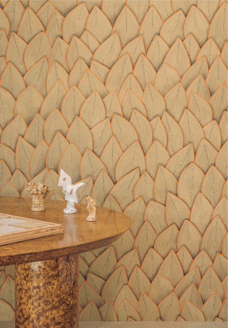 Ideen von Véronique de Soultrait sind hier verwirklicht, Knoten aus Seil und Kordel werde gelöst, um beide Materialien mit der Welt von heute zu verbinden. Die Künstlerin entwickelt die Flechtkunst auf ihr höchstes Niveau und führt Seil und Kordel in die malerische Welt des Art déco. Ebenso frei wie bis ins Detail ausgearbeitet zeigen diese Kreationen Kurvenlinien in Form von grafischen Figuren, unendlich miteinander verwobenen Motiven oder geometrisch strukturierten Kompositionen. Die sich wiederholenden Wellenmotive lassen die berühmten Innendekors der Künstlerin erkennen; sie verdeutlichen die Geduld in ihren Arbeiten; die Farben – es scheint, als sei ein Metallfaden eingearbeitet – beeindrucken mit ihren subtilen Nuancen.