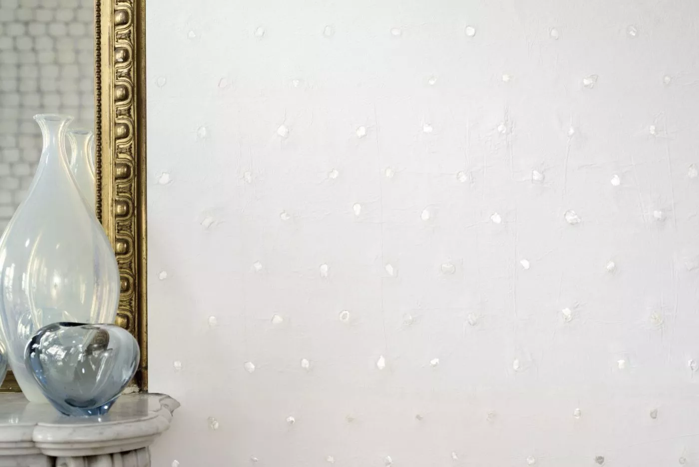 Eine Feier auf der anderen, weit entfernten Seite des Ufers. Die Materialien, die seit jeher von Handwerkern verarbeitet wurden, verbinden sich totemähnlich: Perlmutt mit Abaca, Bast mit Metallfäden, das Blatt mit Farbpigmenten aus der Malerei. So sind sie: vermischt, gewebt, gelocht, verziert. Im Mondlicht der Zeiten sieht man die originellen Zeichnungen hervortreten. Subtile Raster, irisierende Perforationen, geometrische Melodien…