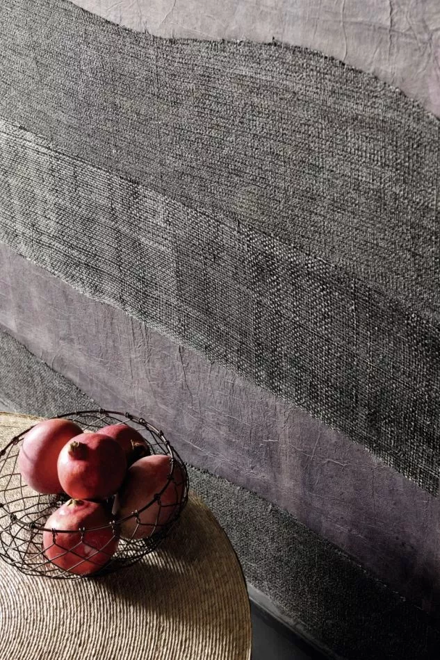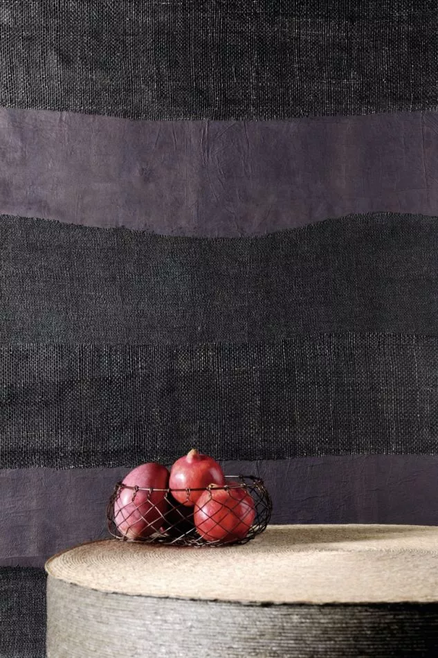 Breite Papier- und Jutestreifen, gefärbt und von Hand auf Vliesträger kaschiert