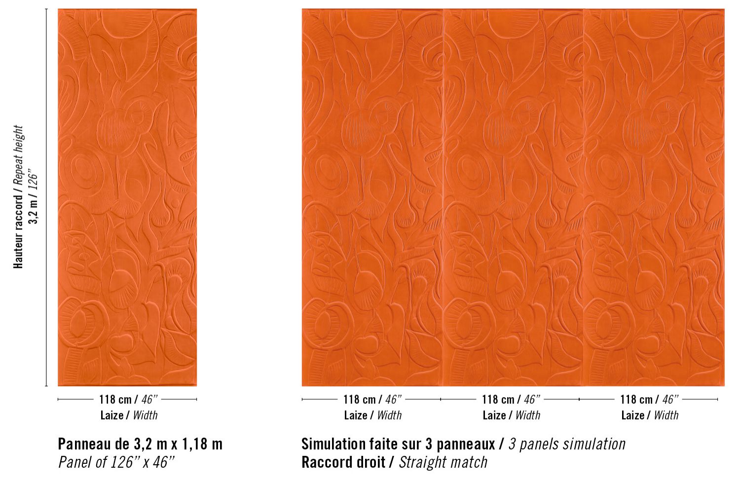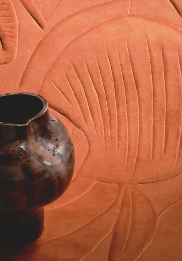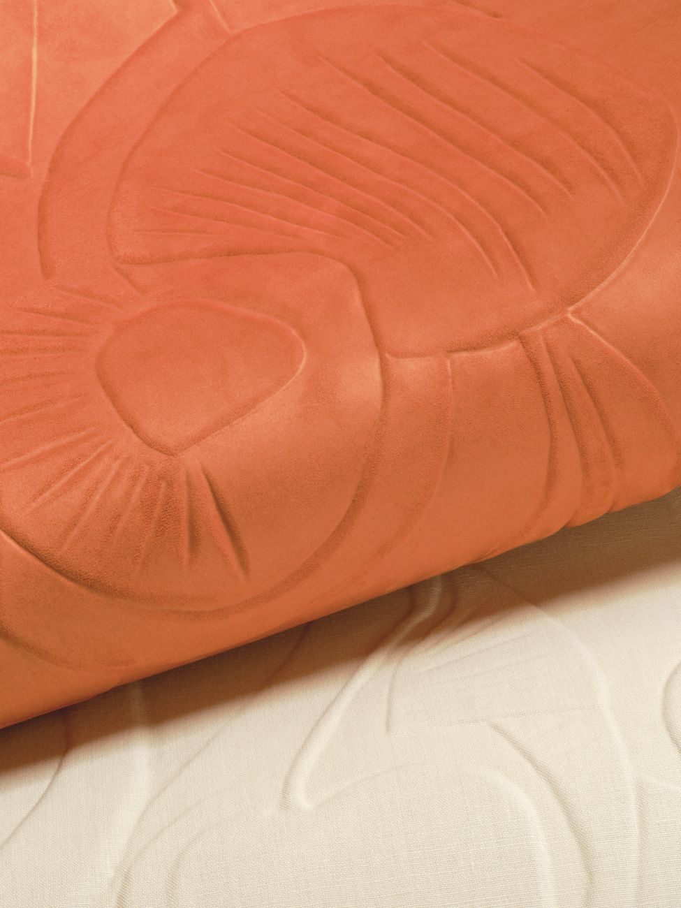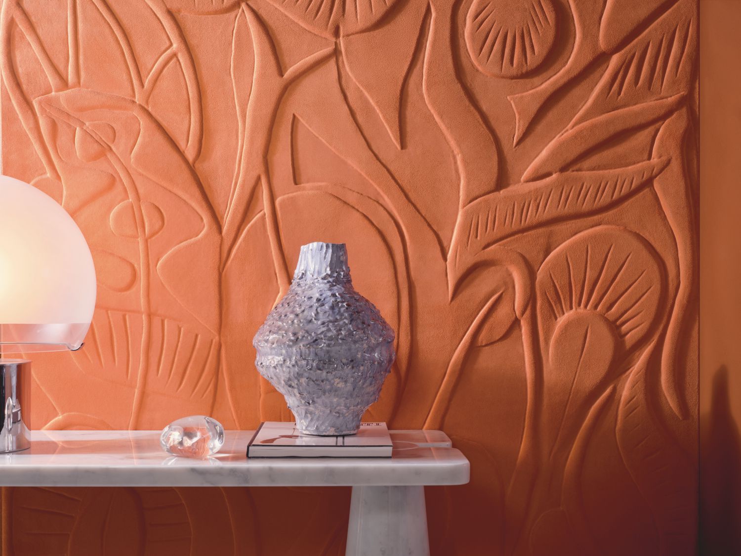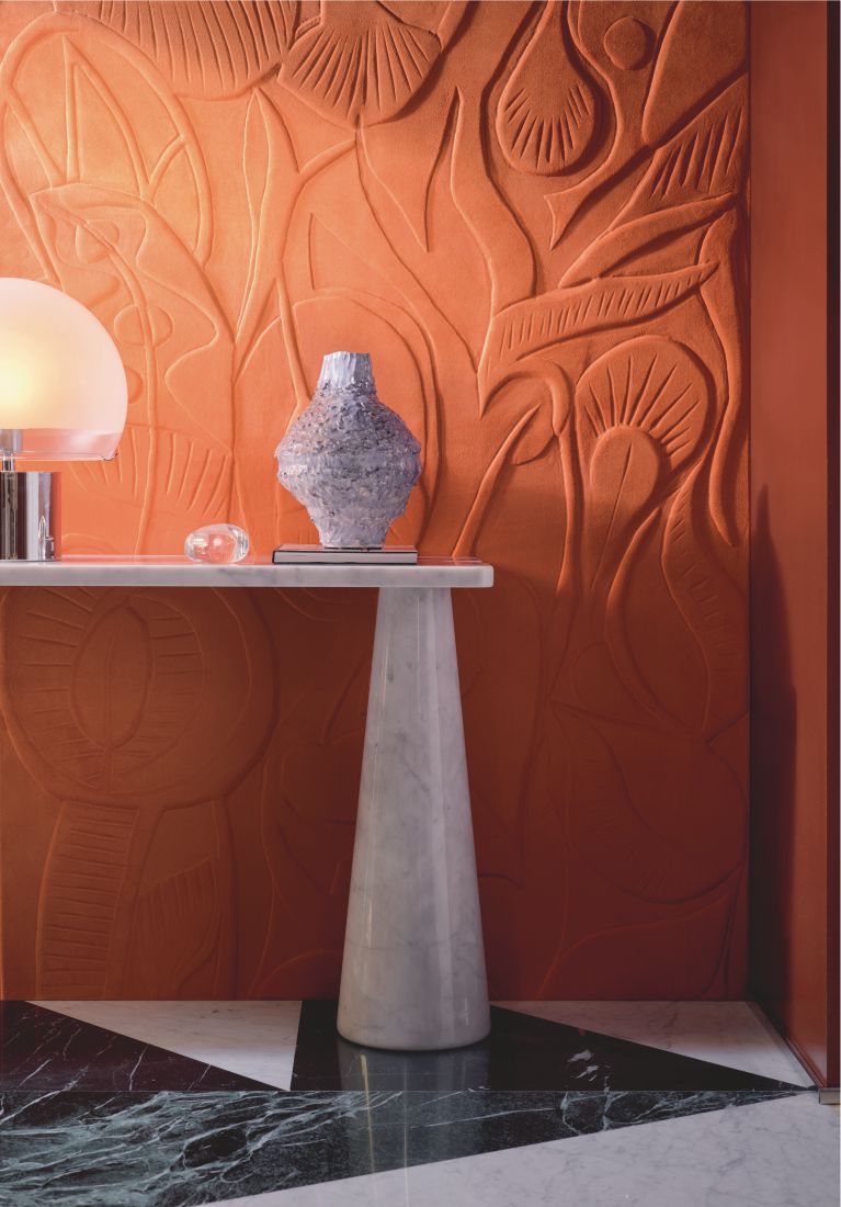Die Kollektion zeigt sich mit phantasievollen Kreationen sowie beeindruckenden, dekorativen Spachtelarbeiten, bei denen die majestätische Schönheit durch Materialien wie Chenille-Samt abgedämpft wird, durch Wildlederimitat wie zu einer zweiten Haut verfeinert oder durch strukturierte Leinengewebe der Marke Élitis bereichert wird.Es entsteht ein monumentales Motiv von samtweich wirkenden Spachtelarbeiten, in denen das Licht eine angenehme, fast bildhauerische Tiefe verleiht.