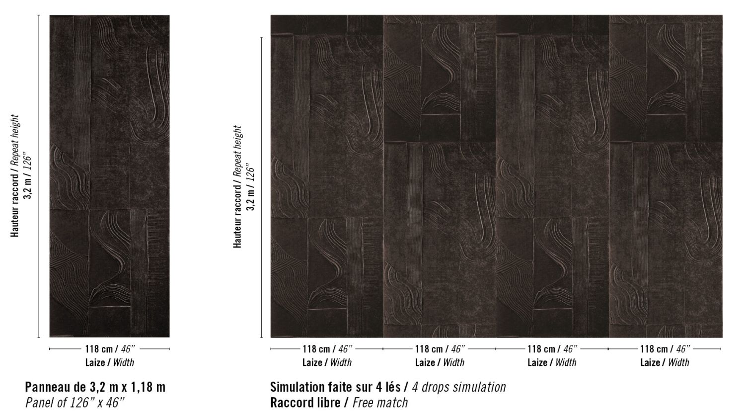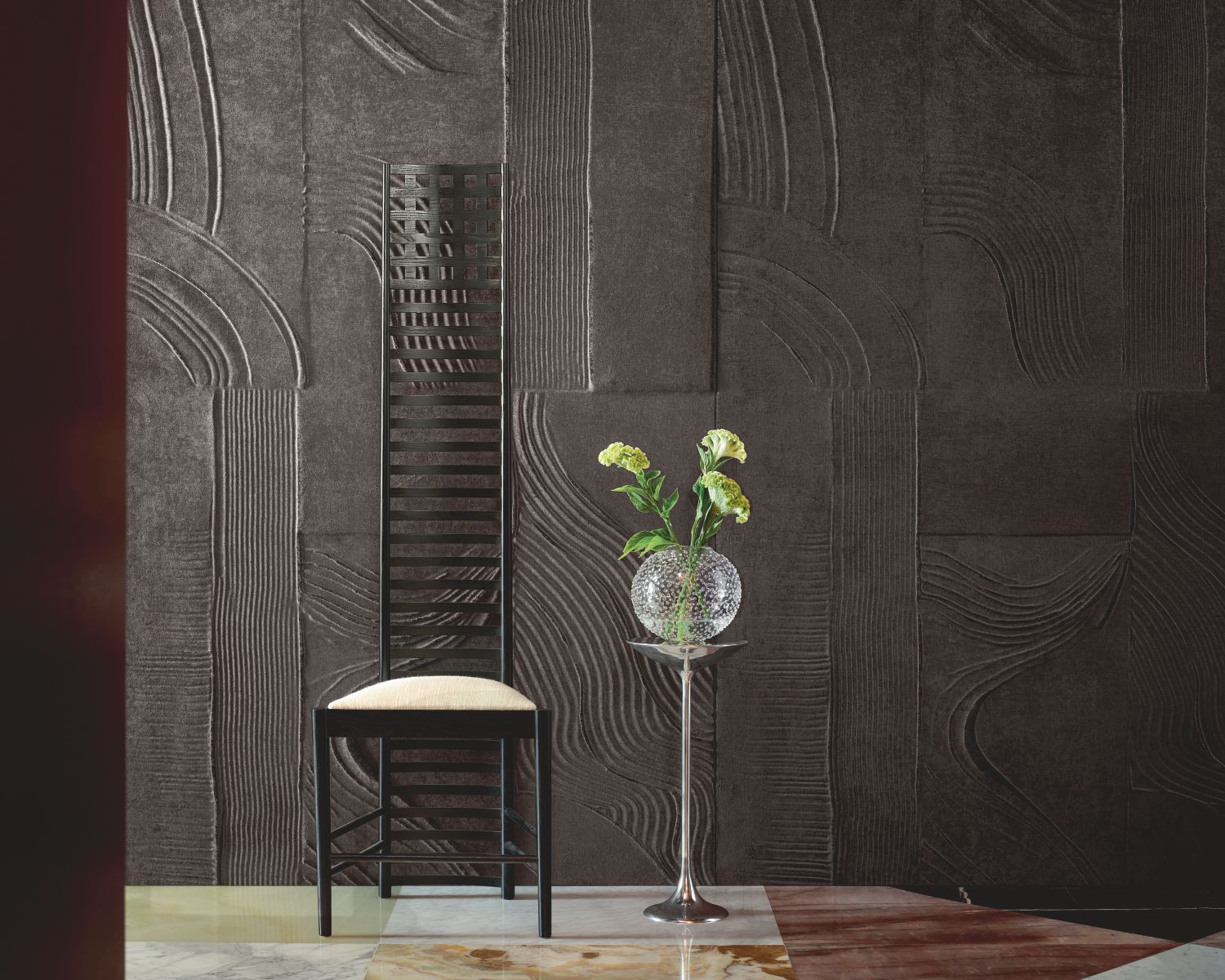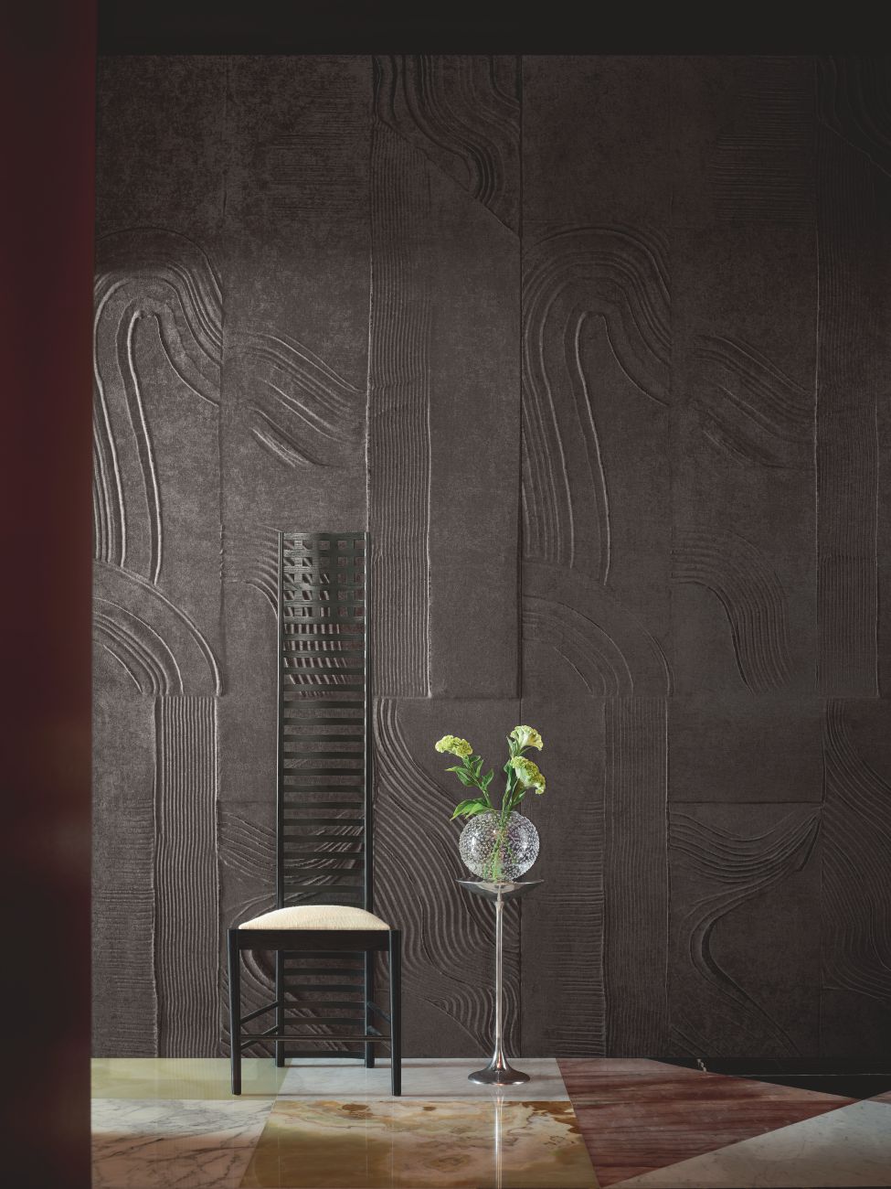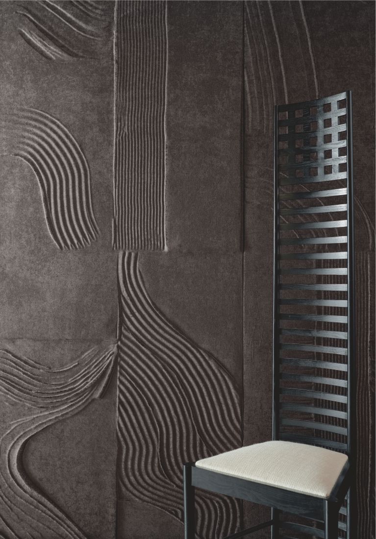 Die Kollektion zeigt sich mit phantasievollen Kreationen sowie beeindruckenden, dekorativen Spachtelarbeiten, bei denen die majestätische Schönheit durch Materialien wie Chenille-Samt abgedämpft wird, durch Wildlederimitat wie zu einer zweiten Haut verfeinert oder durch strukturierte Leinengewebe der Marke Élitis bereichert wird.