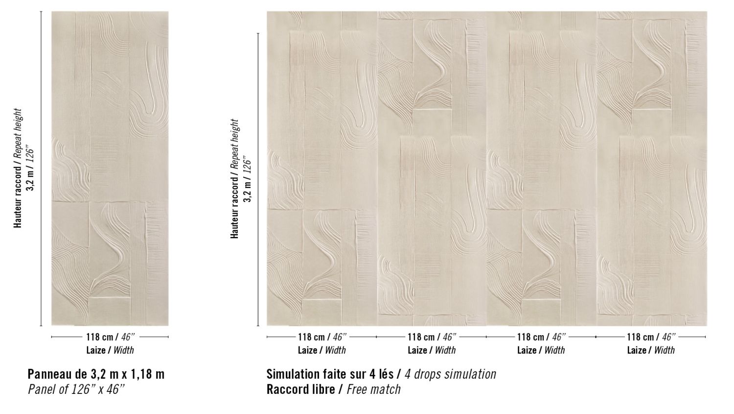 Die Kollektion zeigt sich mit phantasievollen Kreationen sowie beeindruckenden, dekorativen Spachtelarbeiten, bei denen die majestätische Schönheit durch Materialien wie Chenille-Samt abgedämpft wird, durch Wildlederimitat wie zu einer zweiten Haut verfeinert oder durch strukturierte Leinengewebe der Marke Élitis bereichert wird.Es entsteht ein monumentales Motiv von samtweich wirkenden Spachtelarbeiten, in denen das Licht eine angenehme, fast bildhauerische Tiefe verleiht.