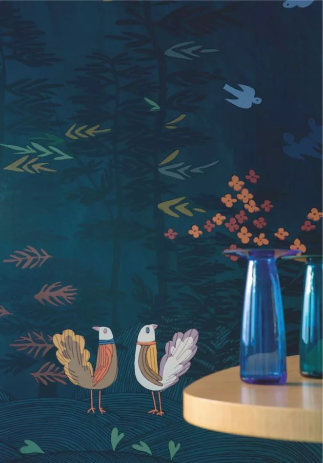 Eine von der indischen Miniaturmalerei inspirierte Tapetensammlung: farbige, stilisierte Darstellungen von Szenen aus dem Alltag. 5 Designs und 3 Panoramamotive.
