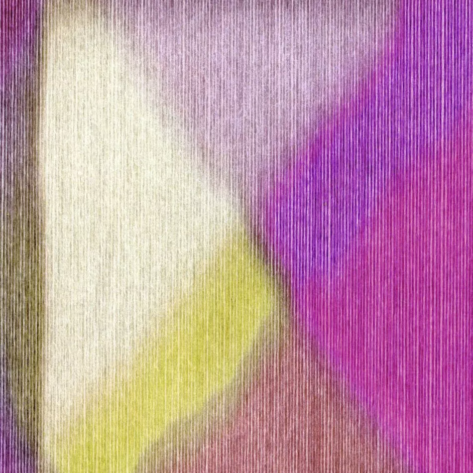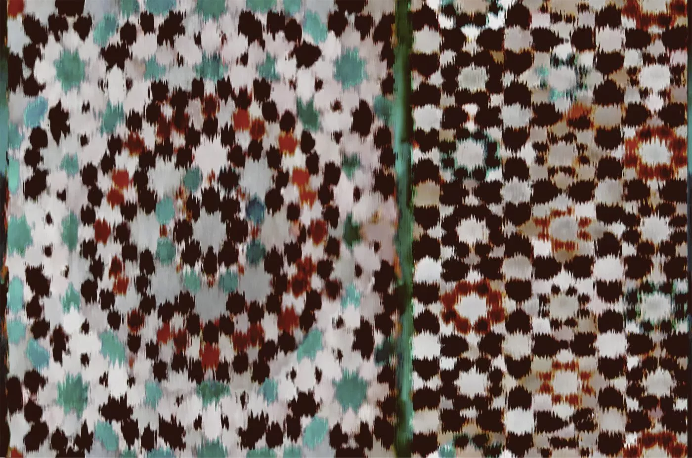 Ein auf Vlies geklebter Fil-à-fil gibt den Ton an. Textildruck inspiriert von marokkanischen Farben, indonesischen Sarongs und Batikstoffen. Unter der Farbe der gemalten Motiven verschwimmen die Dessins.