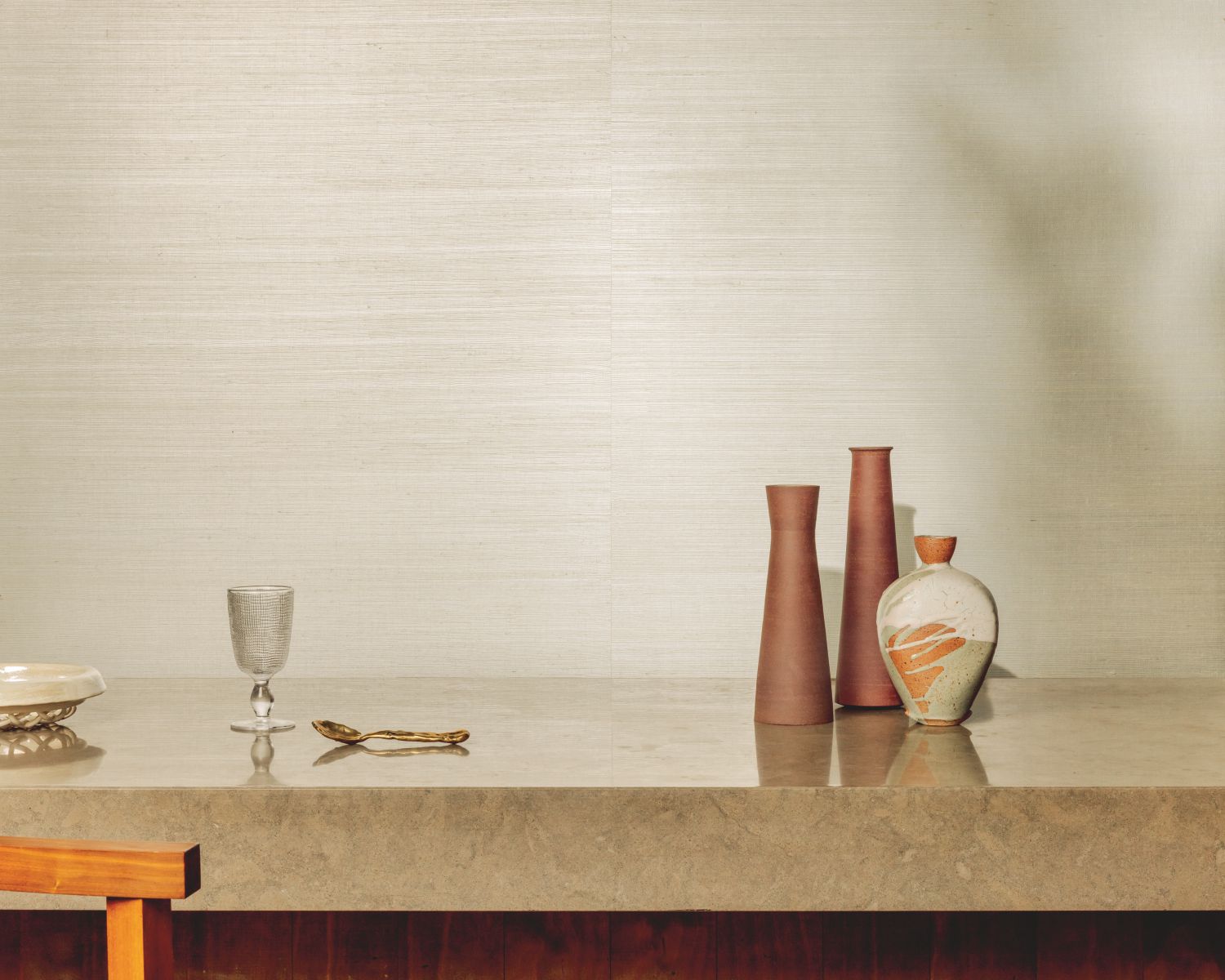 In der Maestria-Kollektion verbinden Pflanzenfasern Gesso und Sisal auf innovative Weise und entführen uns in anspruchsvolle neue Atmosphären: mal beruhigend, mal verspielt, aber stets elegant.