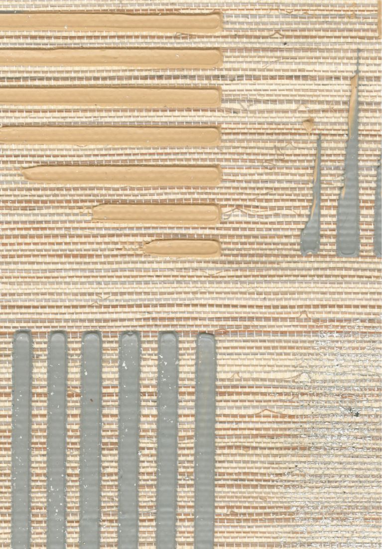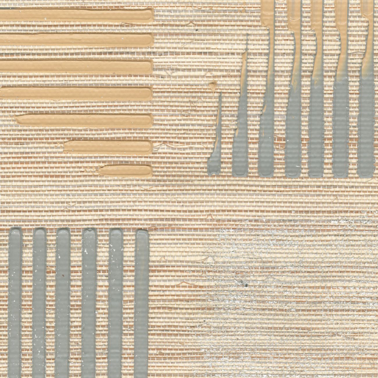 Horizontale und vertikale Linien, die in hellen Quadraten angeordnet sind, werden auf einer Gesso-Basis mit Gold, Silber und Kupfer hervorgehoben.