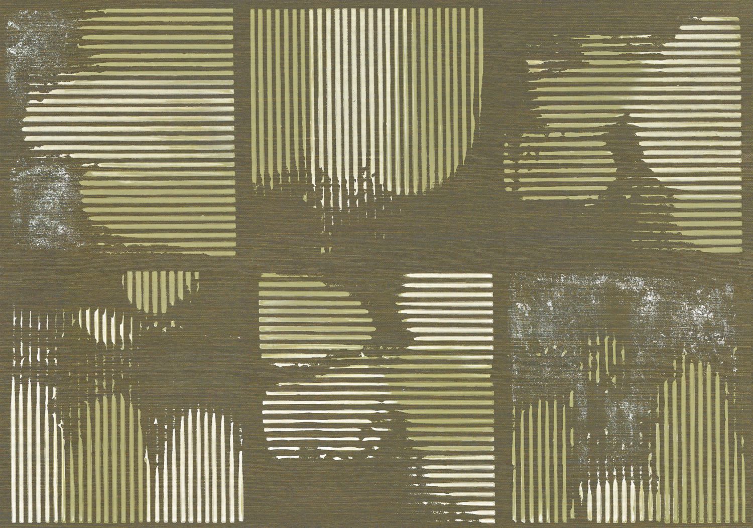 Horizontale und vertikale Linien, die in hellen Quadraten angeordnet sind, werden auf einer Gesso-Basis mit Gold, Silber und Kupfer hervorgehoben.