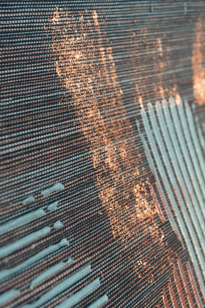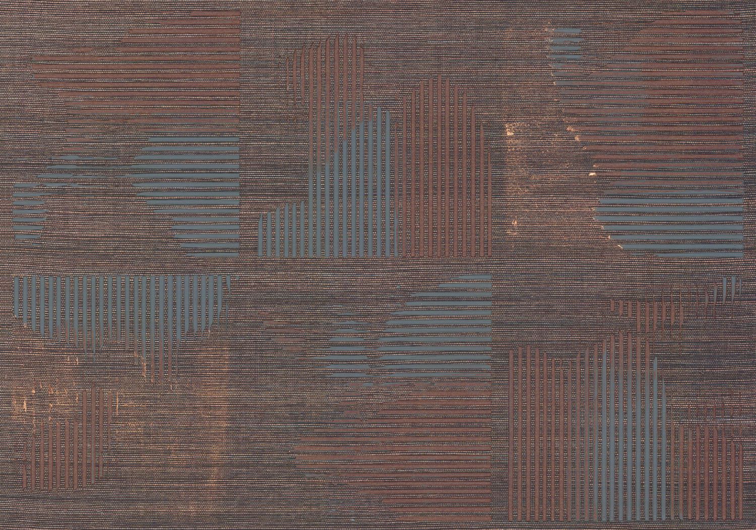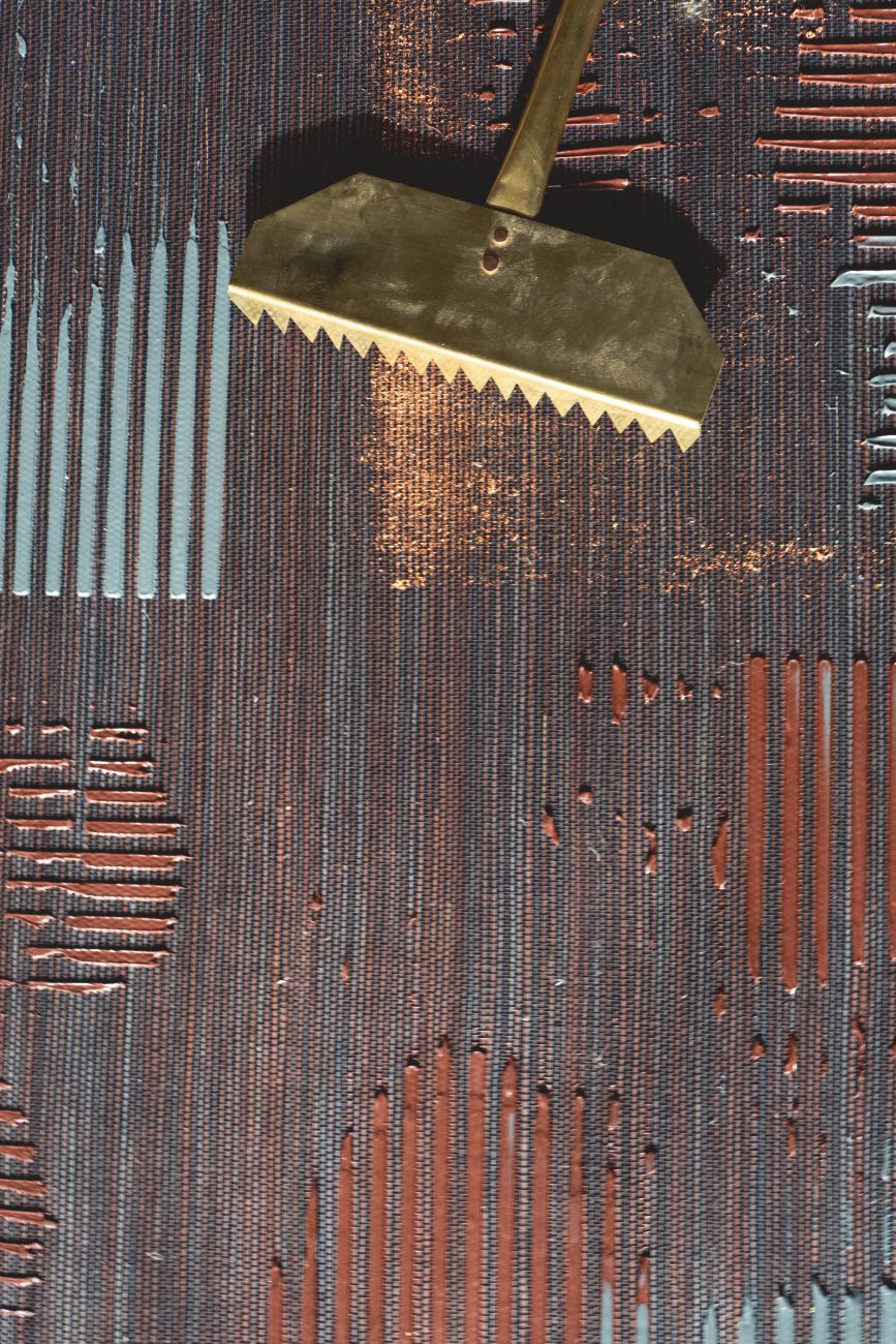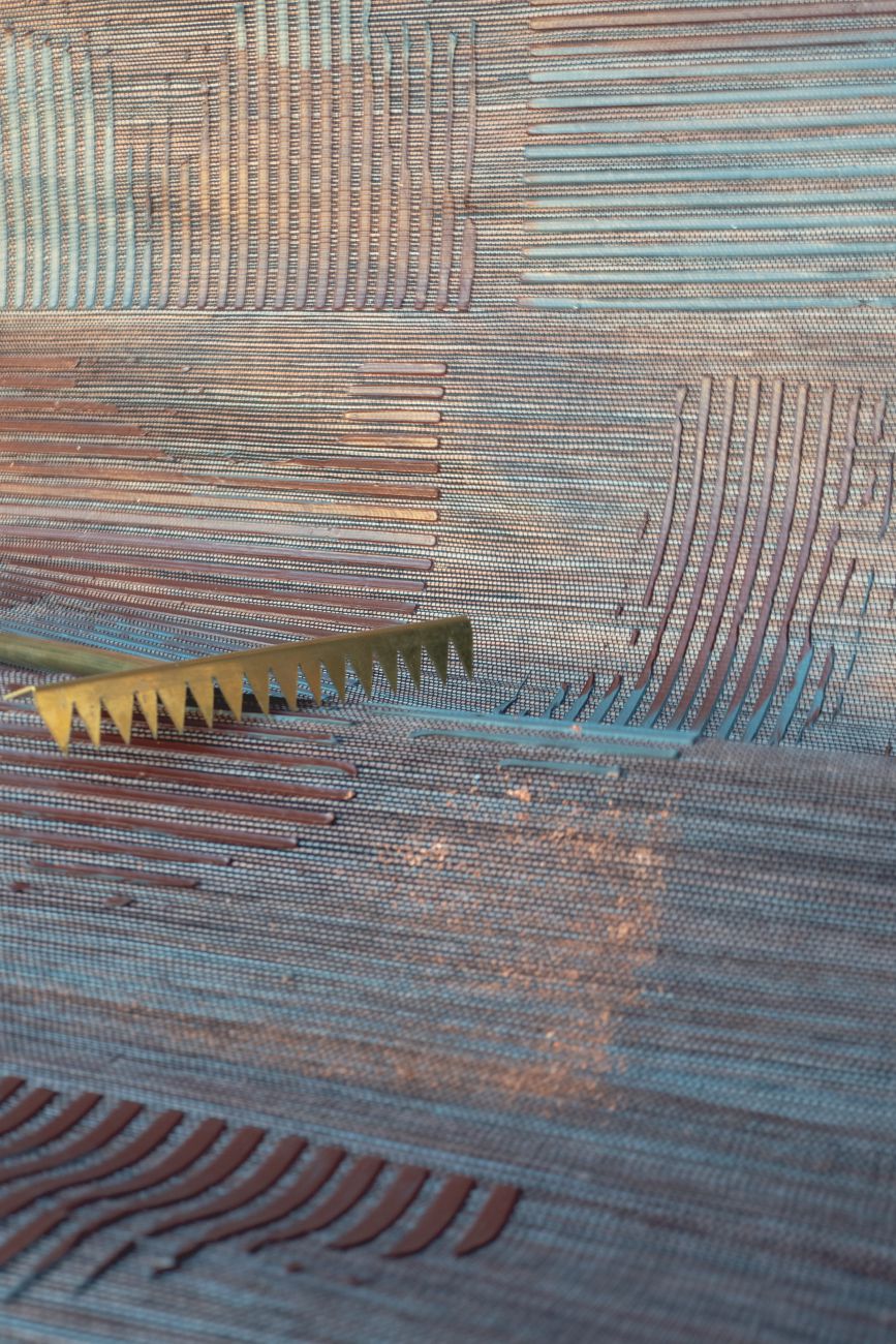 Horizontale und vertikale Linien, die in hellen Quadraten angeordnet sind, werden auf einer Gesso-Basis mit Gold, Silber und Kupfer hervorgehoben.