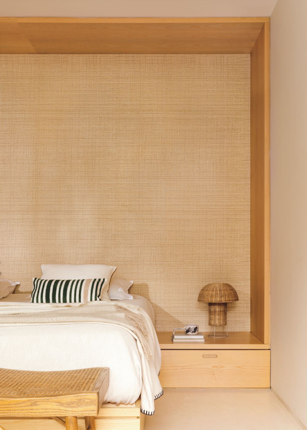 Beschreibung: Geprägte Vinyltapete mit dem Aussehen pflanzlicher Fasern