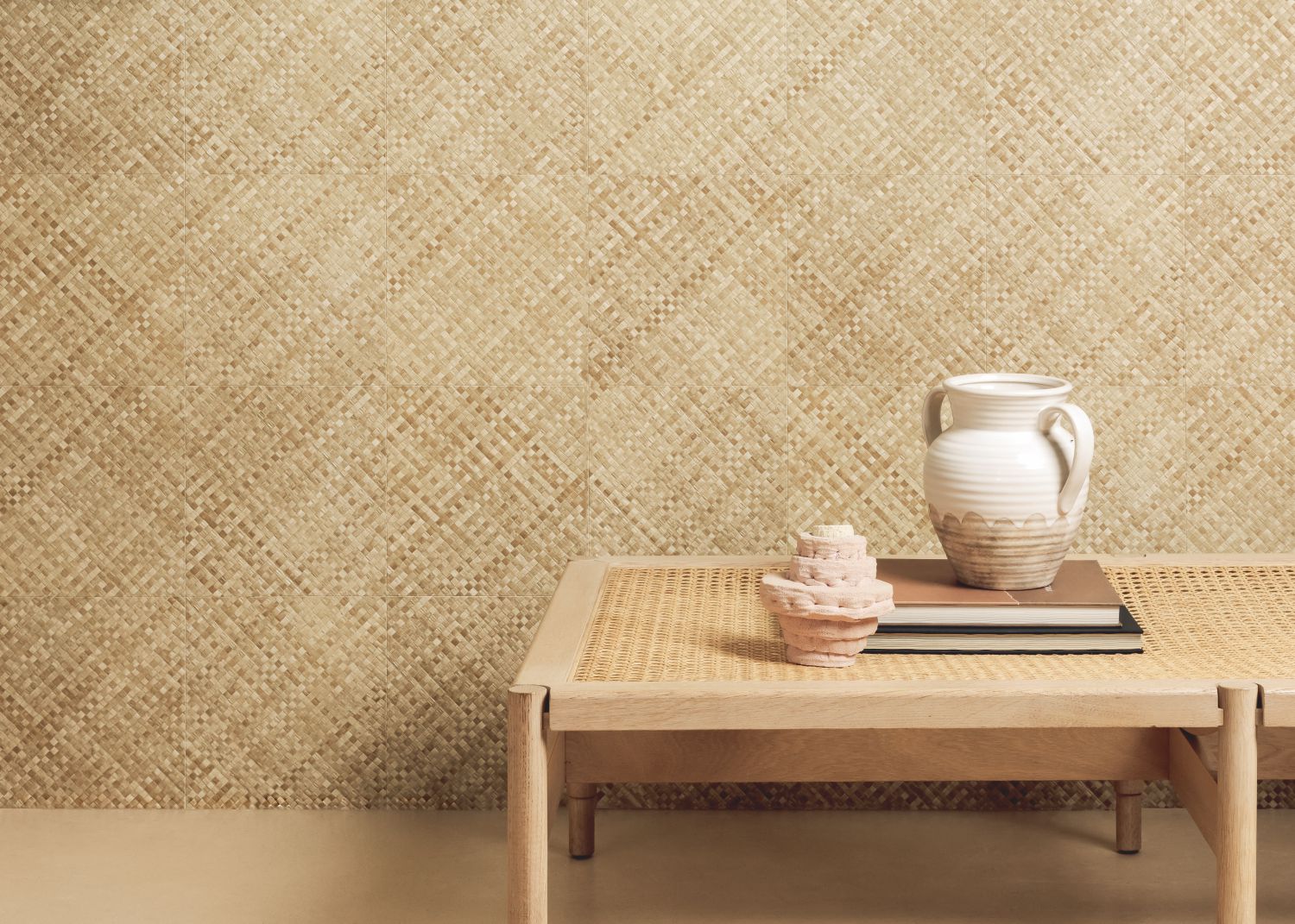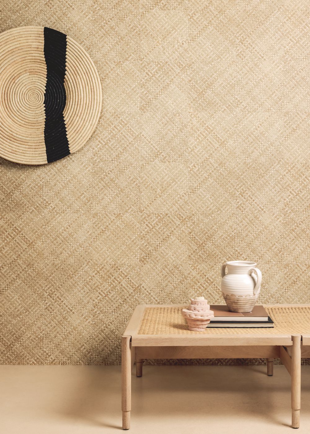 Beschreibung: Geprägte Vinyltapete mit dem Aussehen pflanzlicher Fasern
