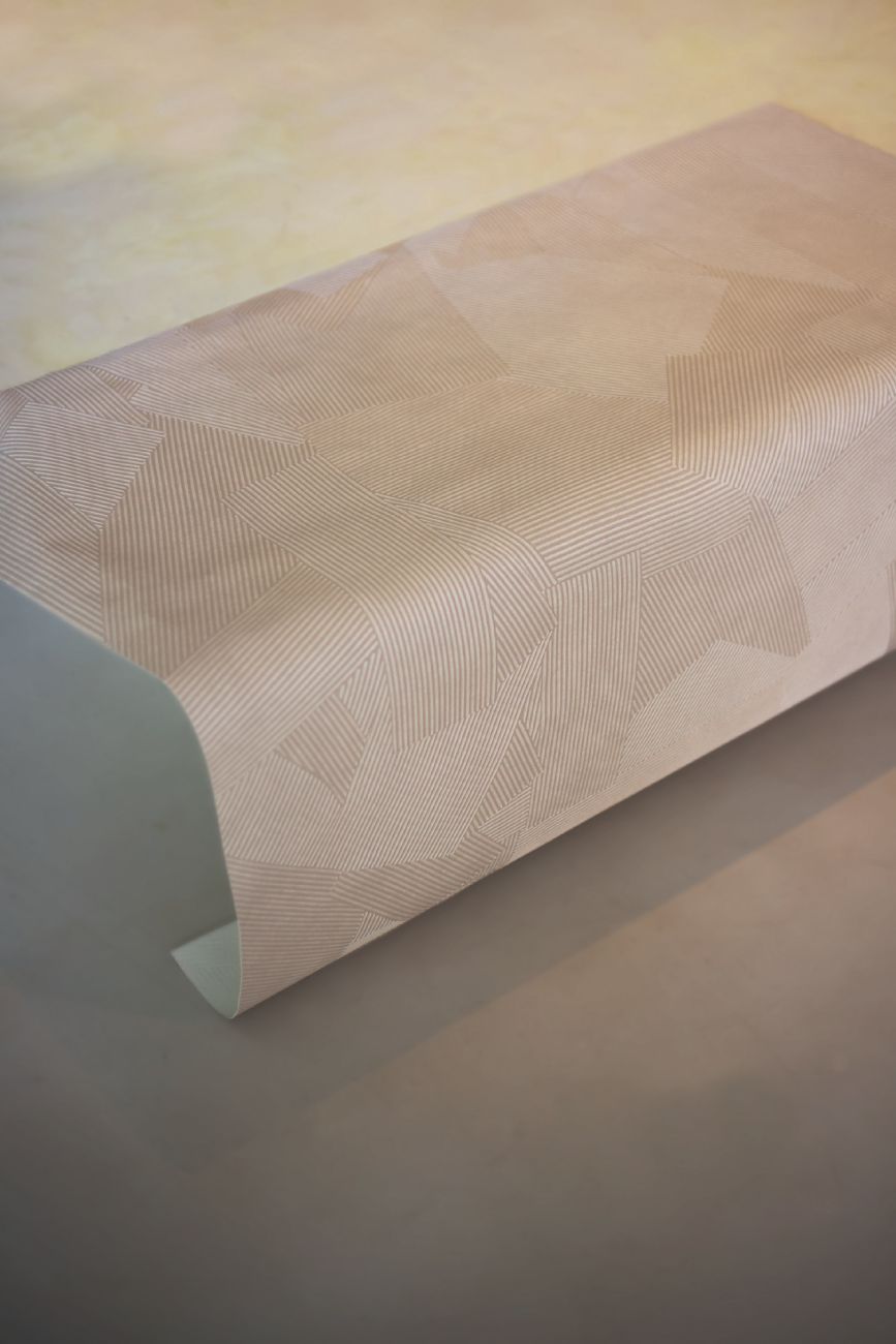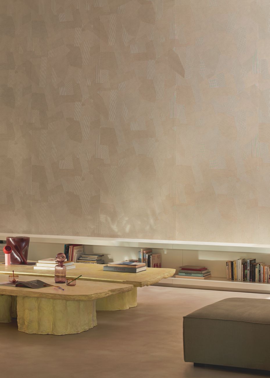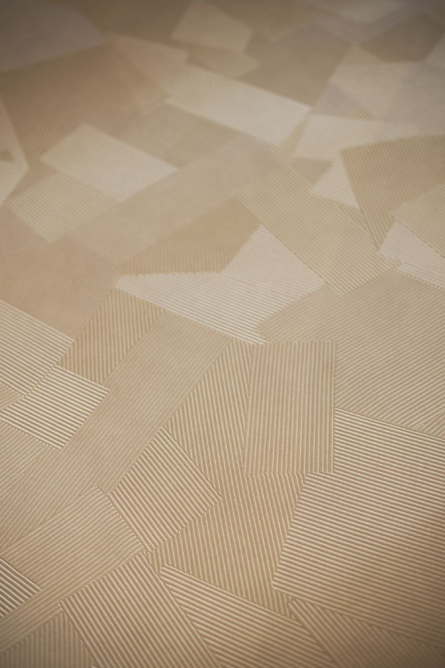 In dieser Kollektion dient die Kunst als visuelle Aufzeichnung von Bewegung: Die Gesten der Künstler werden durch die verspielte, kartografische Komposition von Hunderten winziger Gipsrillen eingefangen.