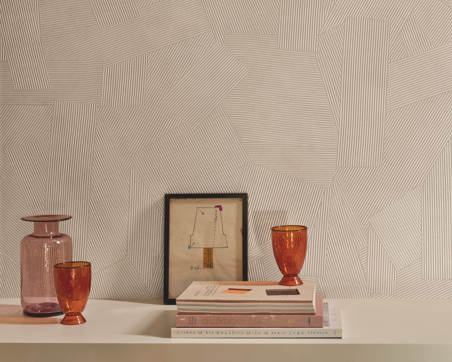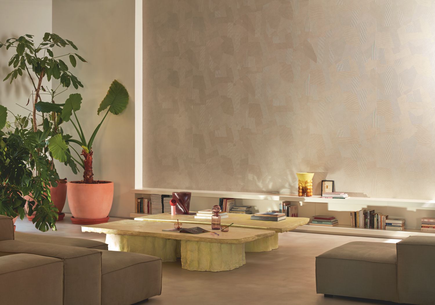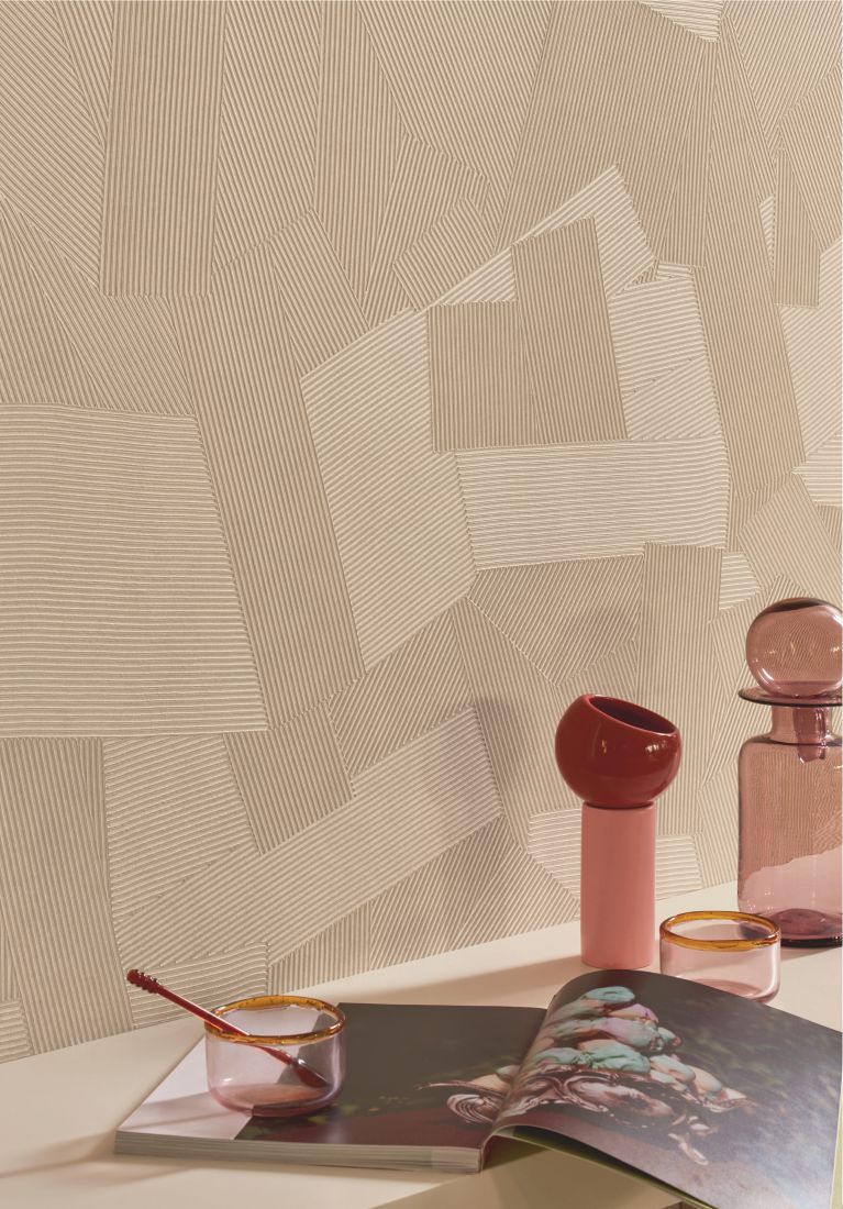 In dieser Kollektion dient die Kunst als visuelle Aufzeichnung von Bewegung: Die Gesten der Künstler werden durch die verspielte, kartografische Komposition von Hunderten winziger Gipsrillen eingefangen.