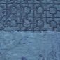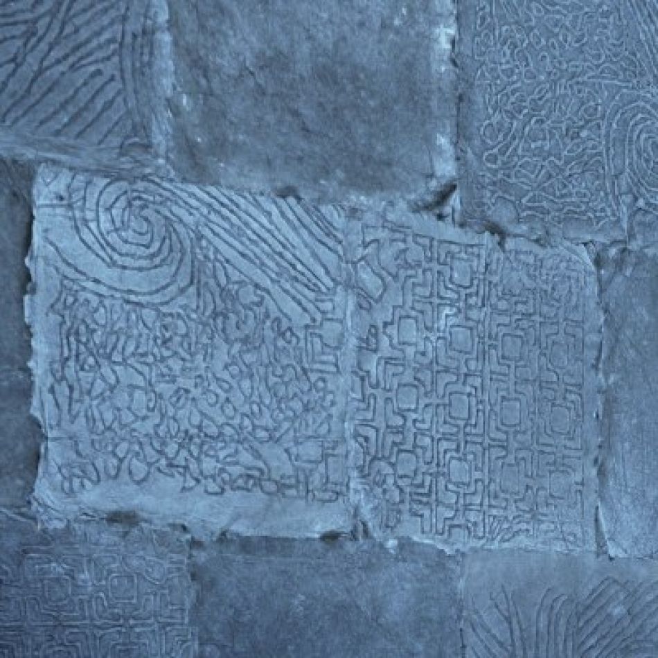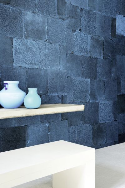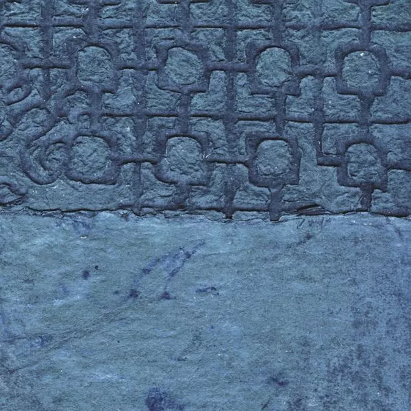 Handgefärbte Papierblätter, zufällig im Schachbrettmuster angeordnet, enthüllen ihre geometrischen Muster. Ein handwerklich gefertigtes Patchwork aus 28 cm großen Blättern, auf die Breite der Wandverkleidung geklebt.