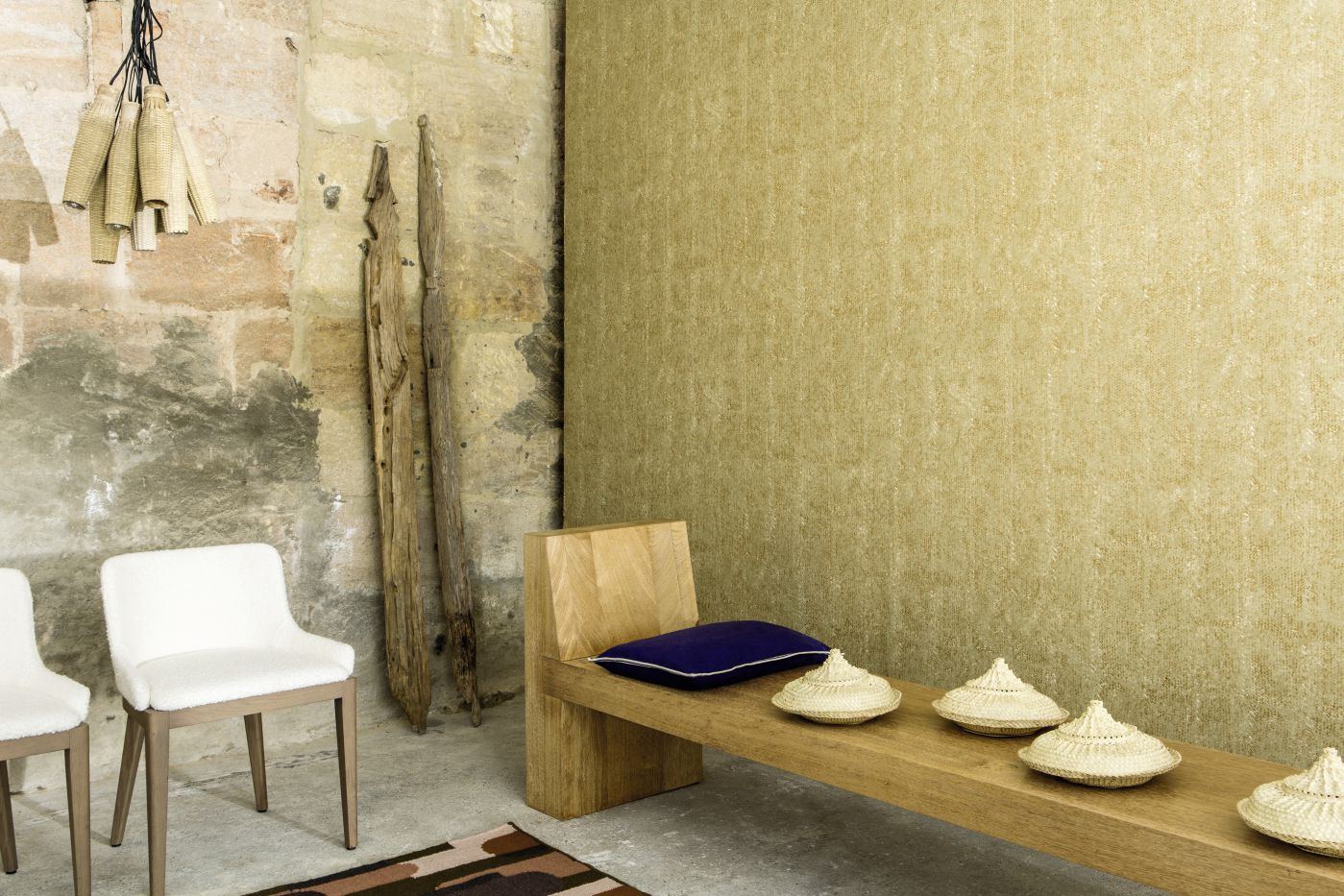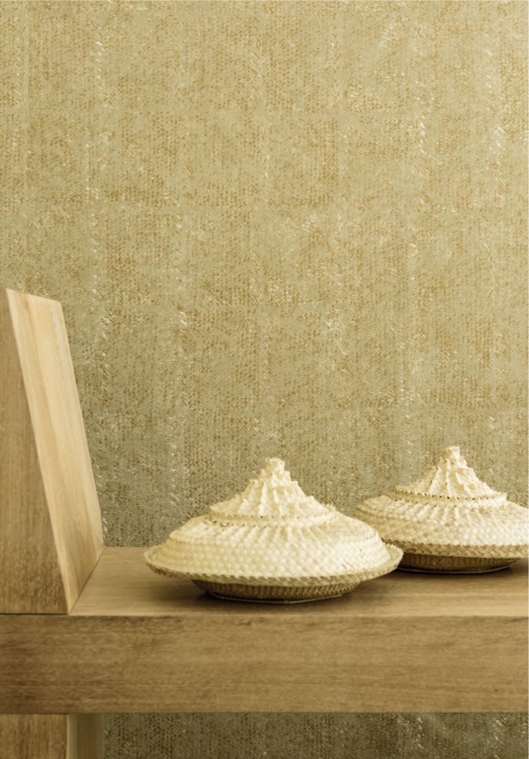 Dieses mit Vinyl bestrichene Papier in Waffelstruktur ist eine Hommage an die Verarbeitung einer natürlichen Faser zu Objekten des Alltags.