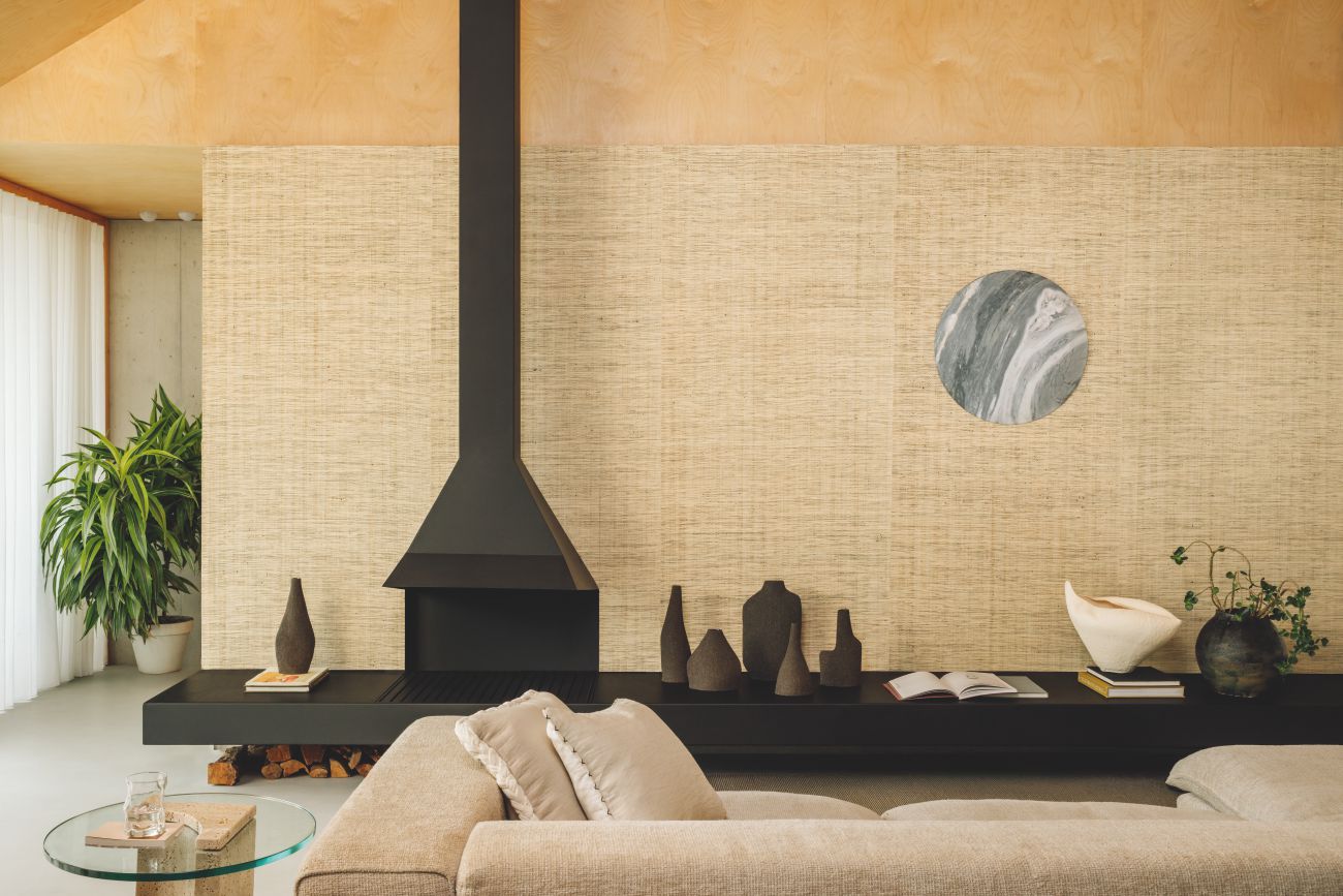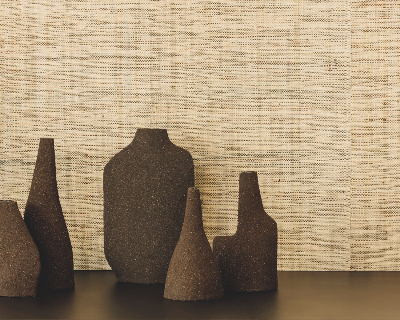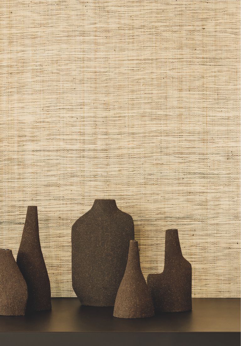 Die Kreationen sind geprägt vom ruhigen Charme des Yūgen und der tiefgründigen Schönheit Japans. Indem die Kollektion die Verbindung zwischen Natur, Licht, Material und Emotion erkundet, verbreitet sie ruhige, beruhigende Atmosphären. Mit dem Ziel, Einfachheit im Raum zu schaffen, sprechen die Kreationen eine Sprache der Gelassenheit, beginnen einen Dialog zwischen Leere und Fülle, indem sie luftig abstrakte Motive zu Wort kommen lassen: strukturierte Faux-Uni-Stoffe spielen hier mit kunstvollen Knoten. Raphia, Leinen, Wolle – diese lebendigen Materialien zeigen durch ihre natürlichen Unebenheiten taktile Schattierungen. Details sind hier auf ersten Blick unsichtbar, belohnen aber das geduldige Auge. Dort symbolisiert ein riesiger, skizzenhaft gestickter Baum auf Panorama-Tapete die Kraft der Ruhe. Mit klarer Einfachheit bietet die feine, diskrete Ästhetik von Origines einen fast schon mystischen Zufluchtsort der Sinne, eine Einladung zur Meditation.Beschreibung : Naturtapete