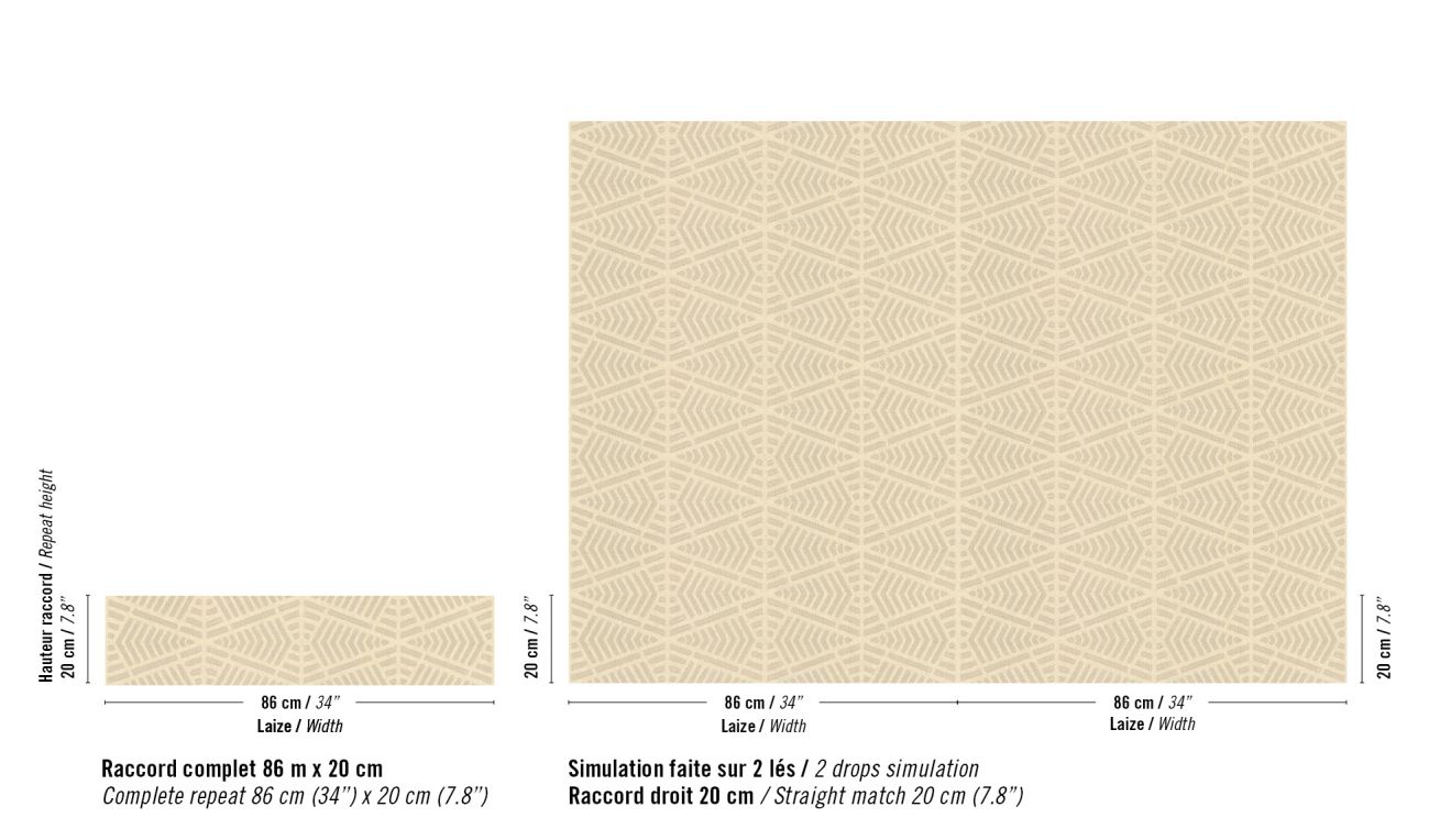 Die Kreationen sind geprägt vom ruhigen Charme des Yūgen und der tiefgründigen Schönheit Japans. Indem die Kollektion die Verbindung zwischen Natur, Licht, Material und Emotion erkundet, verbreitet sie ruhige, beruhigende Atmosphären. Mit dem Ziel, Einfachheit im Raum zu schaffen, sprechen die Kreationen eine Sprache der Gelassenheit, beginnen einen Dialog zwischen Leere und Fülle, indem sie luftig abstrakte Motive zu Wort kommen lassen: strukturierte Faux-Uni-Stoffe spielen hier mit kunstvollen Knoten. Raphia, Leinen, Wolle – diese lebendigen Materialien zeigen durch ihre natürlichen Unebenheiten taktile Schattierungen. Details sind hier auf ersten Blick unsichtbar, belohnen aber das geduldige Auge. Dort symbolisiert ein riesiger, skizzenhaft gestickter Baum auf Panorama-Tapete die Kraft der Ruhe. Mit klarer Einfachheit bietet die feine, diskrete Ästhetik von Origines einen fast schon mystischen Zufluchtsort der Sinne, eine Einladung zur Meditation.Zusammensetzung : 78% LI 22% PES auf Vliesrücken