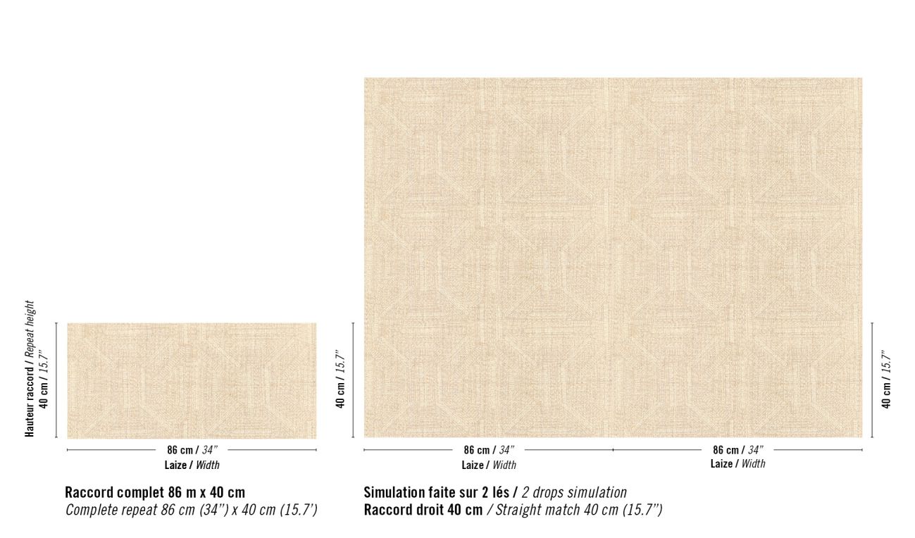Die Kreationen sind geprägt vom ruhigen Charme des Yūgen und der tiefgründigen Schönheit Japans. Indem die Kollektion die Verbindung zwischen Natur, Licht, Material und Emotion erkundet, verbreitet sie ruhige, beruhigende Atmosphären. Mit dem Ziel, Einfachheit im Raum zu schaffen, sprechen die Kreationen eine Sprache der Gelassenheit, beginnen einen Dialog zwischen Leere und Fülle, indem sie luftig abstrakte Motive zu Wort kommen lassen: strukturierte Faux-Uni-Stoffe spielen hier mit kunstvollen Knoten. Raphia, Leinen, Wolle – diese lebendigen Materialien zeigen durch ihre natürlichen Unebenheiten taktile Schattierungen. Details sind hier auf ersten Blick unsichtbar, belohnen aber das geduldige Auge. Dort symbolisiert ein riesiger, skizzenhaft gestickter Baum auf Panorama-Tapete die Kraft der Ruhe. Mit klarer Einfachheit bietet die feine, diskrete Ästhetik von Origines einen fast schon mystischen Zufluchtsort der Sinne, eine Einladung zur Meditation.Zusammensetzung : 83% Raffia 17% PES auf Vliesrücken