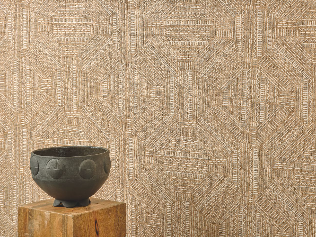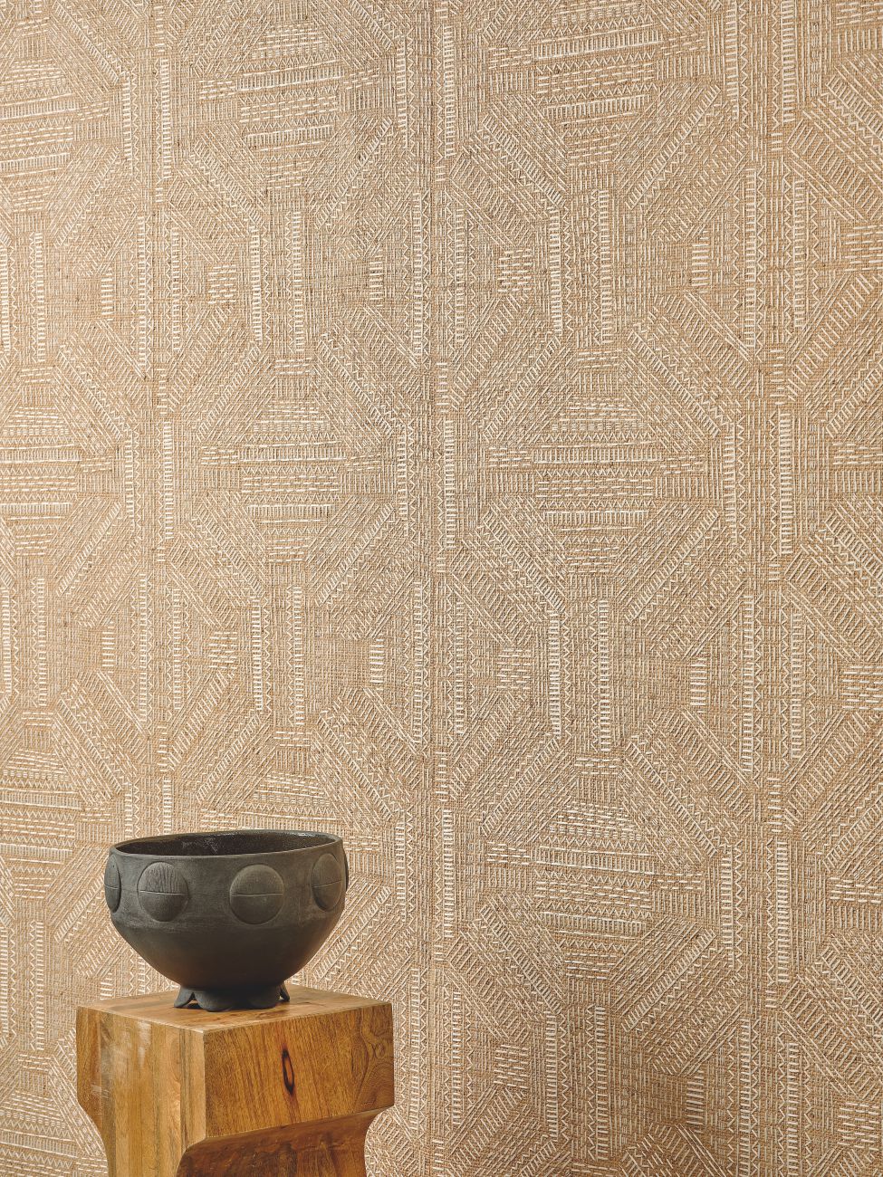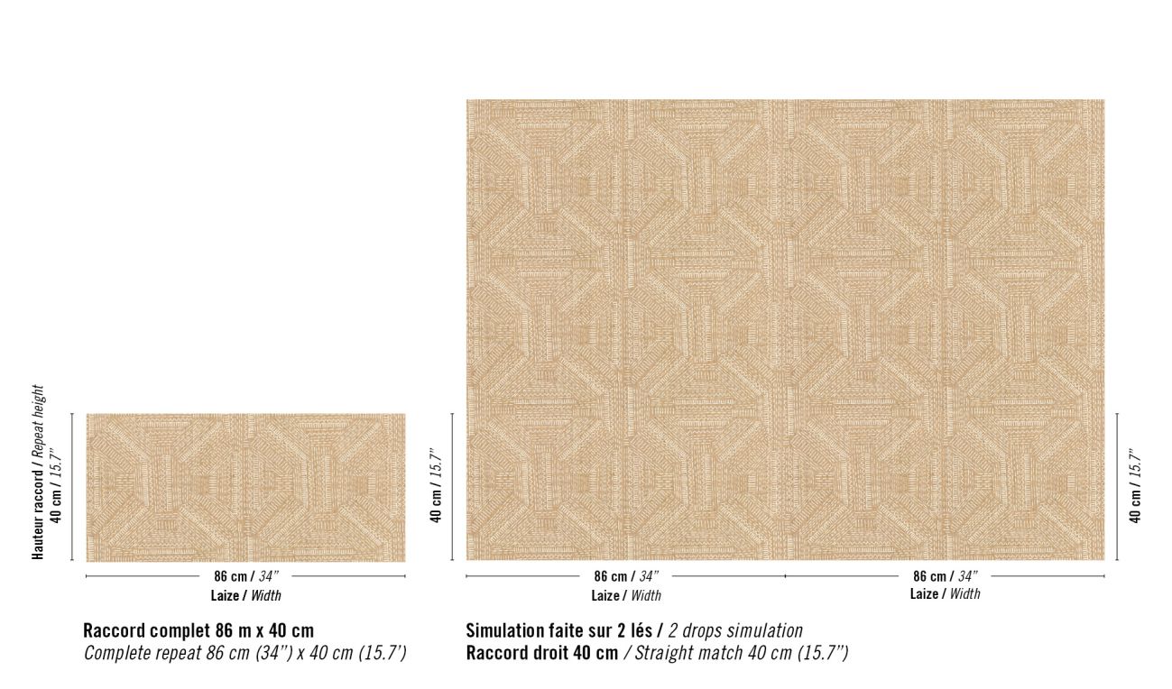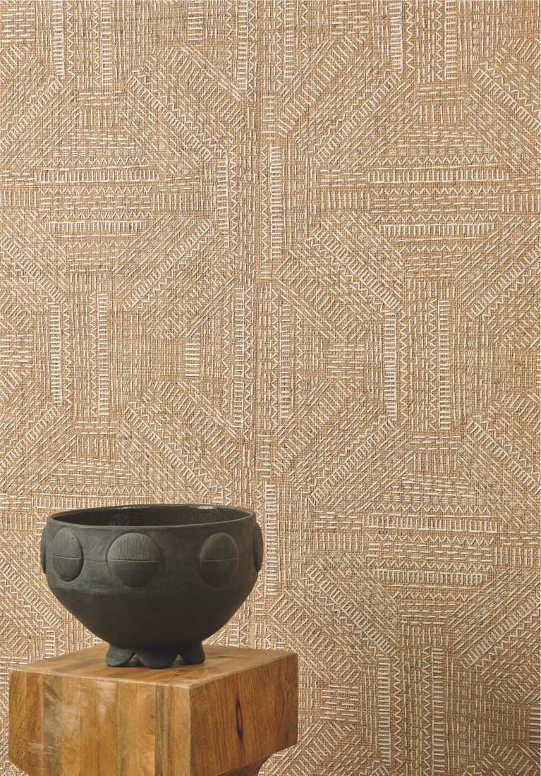 Die Kreationen sind geprägt vom ruhigen Charme des Yūgen und der tiefgründigen Schönheit Japans. Indem die Kollektion die Verbindung zwischen Natur, Licht, Material und Emotion erkundet, verbreitet sie ruhige, beruhigende Atmosphären. Mit dem Ziel, Einfachheit im Raum zu schaffen, sprechen die Kreationen eine Sprache der Gelassenheit, beginnen einen Dialog zwischen Leere und Fülle, indem sie luftig abstrakte Motive zu Wort kommen lassen: strukturierte Faux-Uni-Stoffe spielen hier mit kunstvollen Knoten. Raphia, Leinen, Wolle – diese lebendigen Materialien zeigen durch ihre natürlichen Unebenheiten taktile Schattierungen. Details sind hier auf ersten Blick unsichtbar, belohnen aber das geduldige Auge. Dort symbolisiert ein riesiger, skizzenhaft gestickter Baum auf Panorama-Tapete die Kraft der Ruhe. Mit klarer Einfachheit bietet die feine, diskrete Ästhetik von Origines einen fast schon mystischen Zufluchtsort der Sinne, eine Einladung zur Meditation.Zusammensetzung : 83% Raffia 17% PES auf Vliesrücken