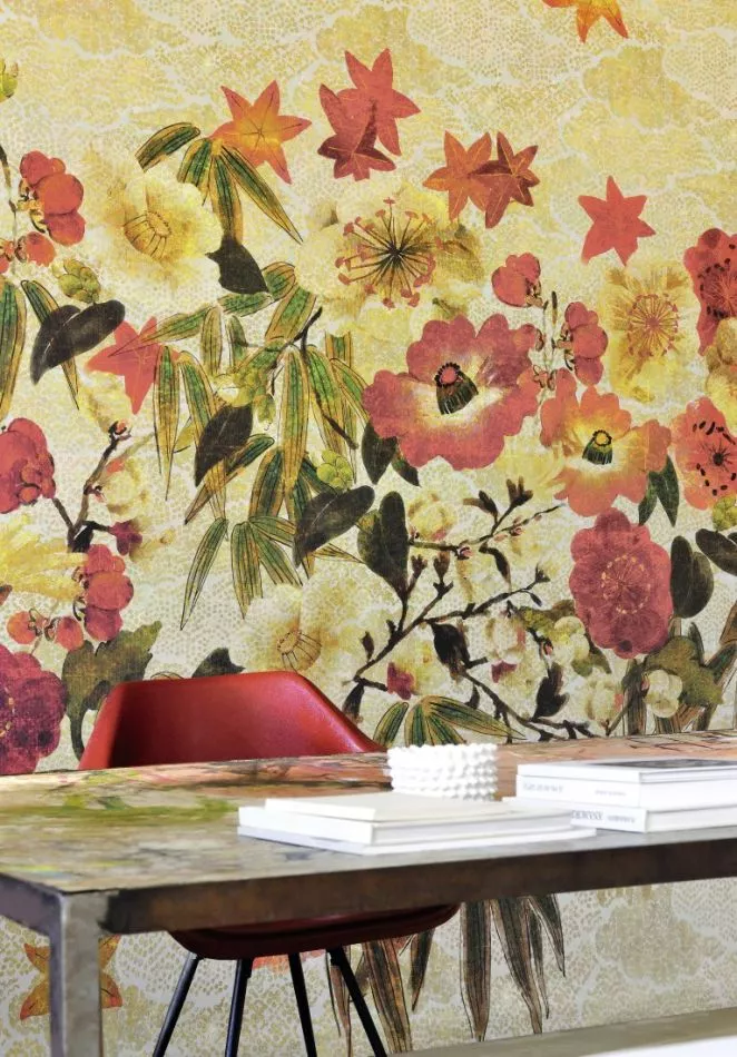 In dieser vielfarbigen Tapetenkollektion übertrumpfen sich fröhlich ausgeprägte Blumen- und Pflanzenmuster.