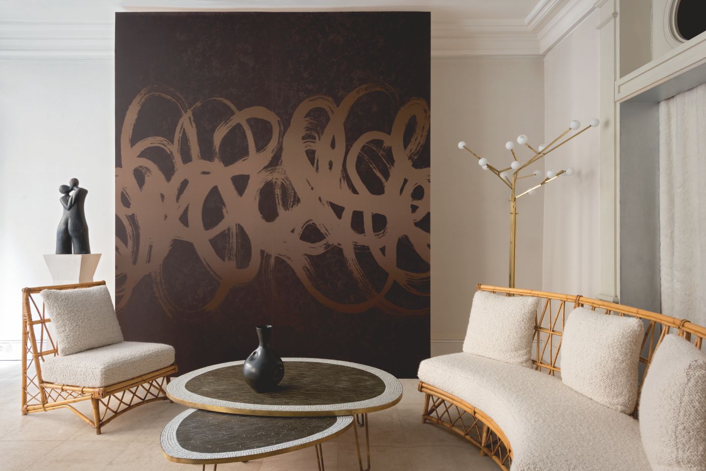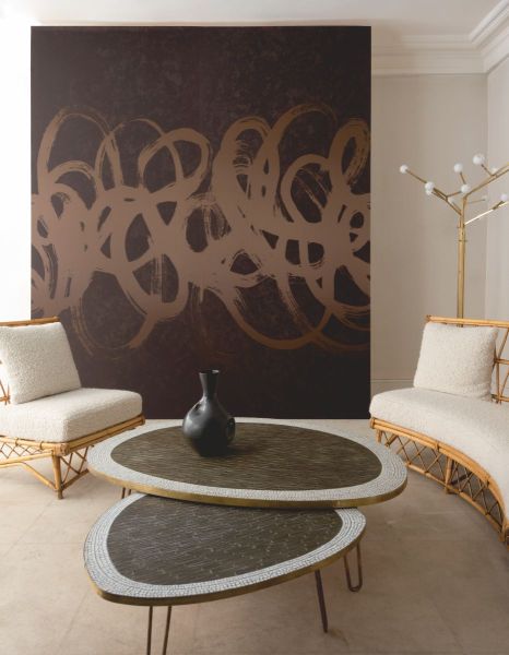 Bei „Mouvements“ kommen zwei ganz neue Digitaltechniken zum Einsatz: lackierter 3D-Druck und die Lasergravierung. Wobei jede Technik neue Effekte ermöglicht, überraschend, Neugierde erweckend, ein wahrer Appel an unsere Sinne. Bei 3D-Druck wird die Tinte einige millimeterstark aufgetragen, wobei sich die glänzende Oberfläche sehr attraktiv vom matten Untergrund absetzt und Volumen zustande kommt, das man beim Anfassen fühlen kann. Bei den Lasergravuren entsteht seidenmatter Aspekt an der Schnittfläche und das Material kommt ganz anders ins Licht, matter und mit geheimnisvollem Relief.