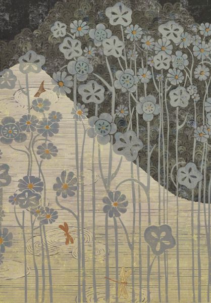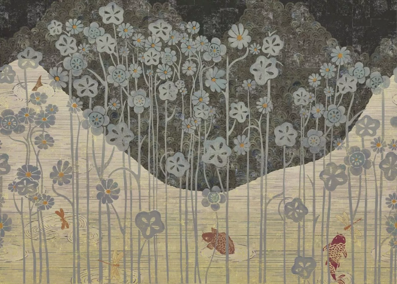 Das Universum ist in Bewegung. Iris, Vögel, Kirschblüten, Fische verlassen die berühmten Kimonos aus dem Land der aufgehenden Sonne und beseelen mit ihren Motiven die Wände. Der Raum wird lebendig und strahlt die anmutige Sanftheit japanischer Farben aus. Die Pracht dieser Panoramagemälde nimmt uns in einer nicht enden wollenden, einer unendlichen Geschichte gefangen .