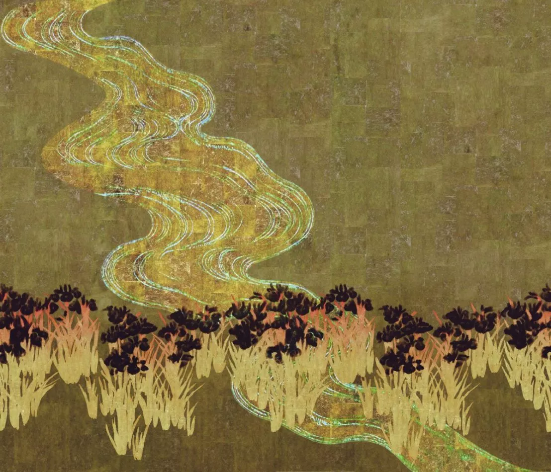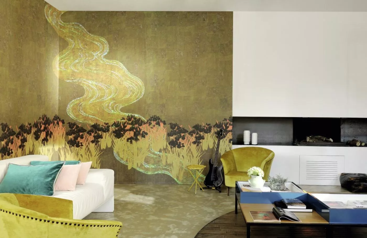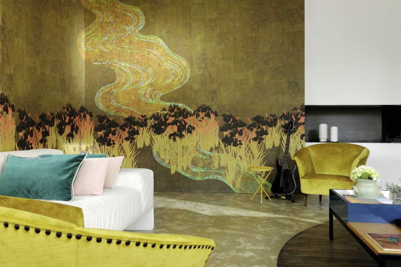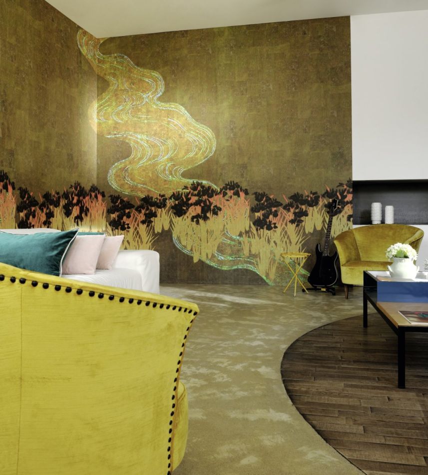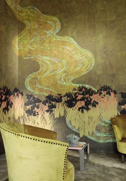 Das Universum ist in Bewegung. Iris, Vögel, Kirschblüten, Fische verlassen die berühmten Kimonos aus dem Land der aufgehenden Sonne und beseelen mit ihren Motiven die Wände. Der Raum wird lebendig und strahlt die anmutige Sanftheit japanischer Farben aus. Die Pracht dieser Panoramagemälde nimmt uns in einer nicht enden wollenden, einer unendlichen Geschichte gefangen .