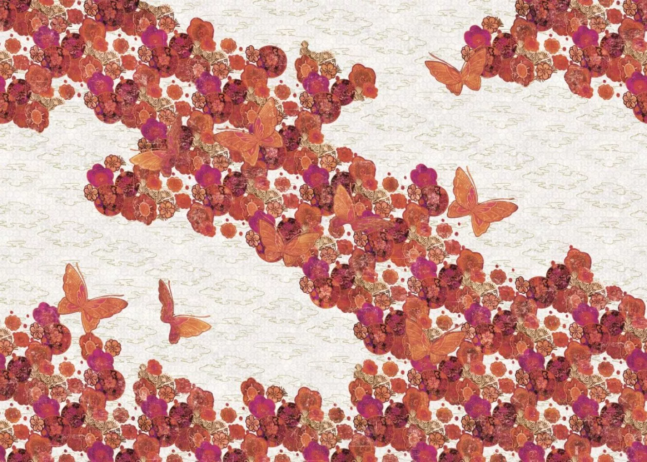 Das Universum ist in Bewegung. Iris, Vögel, Kirschblüten, Fische verlassen die berühmten Kimonos aus dem Land der aufgehenden Sonne und beseelen mit ihren Motiven die Wände. Der Raum wird lebendig und strahlt die anmutige Sanftheit japanischer Farben aus. Die Pracht dieser Panoramagemälde nimmt uns in einer nicht enden wollenden, einer unendlichen Geschichte gefangen .