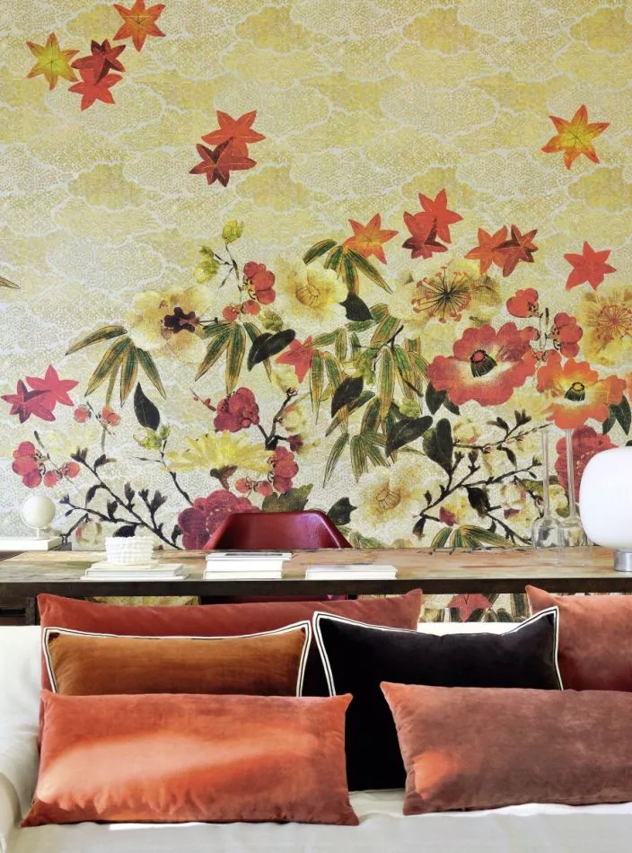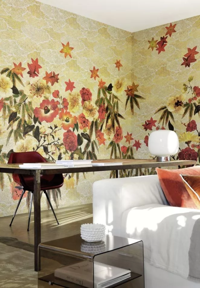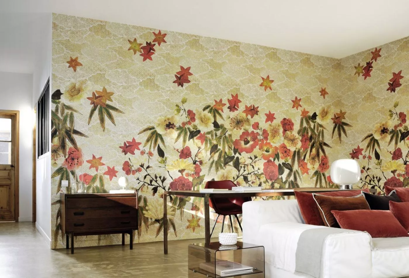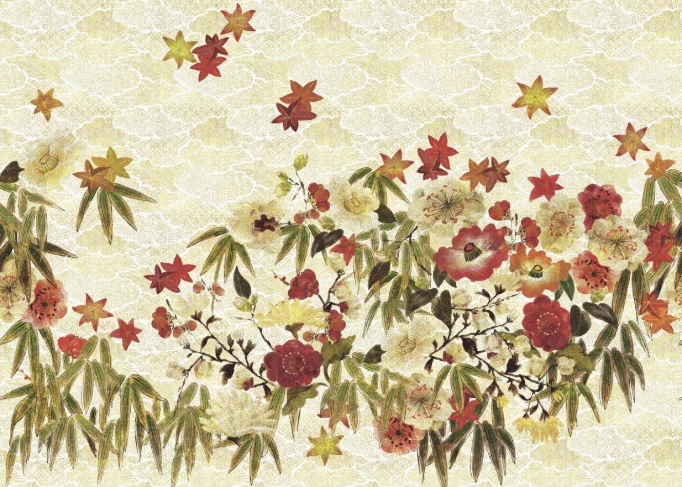 Das Universum ist in Bewegung. Iris, Vögel, Kirschblüten, Fische verlassen die berühmten Kimonos aus dem Land der aufgehenden Sonne und beseelen mit ihren Motiven die Wände. Der Raum wird lebendig und strahlt die anmutige Sanftheit japanischer Farben aus. Die Pracht dieser Panoramagemälde nimmt uns in einer nicht enden wollenden, einer unendlichen Geschichte gefangen .