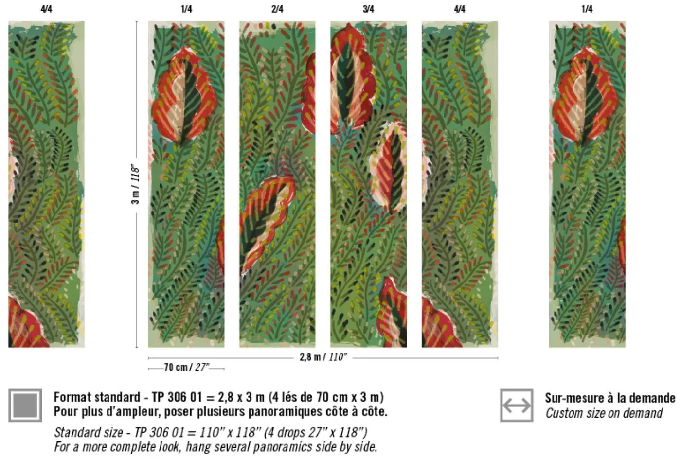 Abmessungen +/- 3% : Wandbild 2,80 m x 3 m, erhältich in 4 Bahnen je 0,7 m Breite oder auf Anfrage ihr Wunschmaß