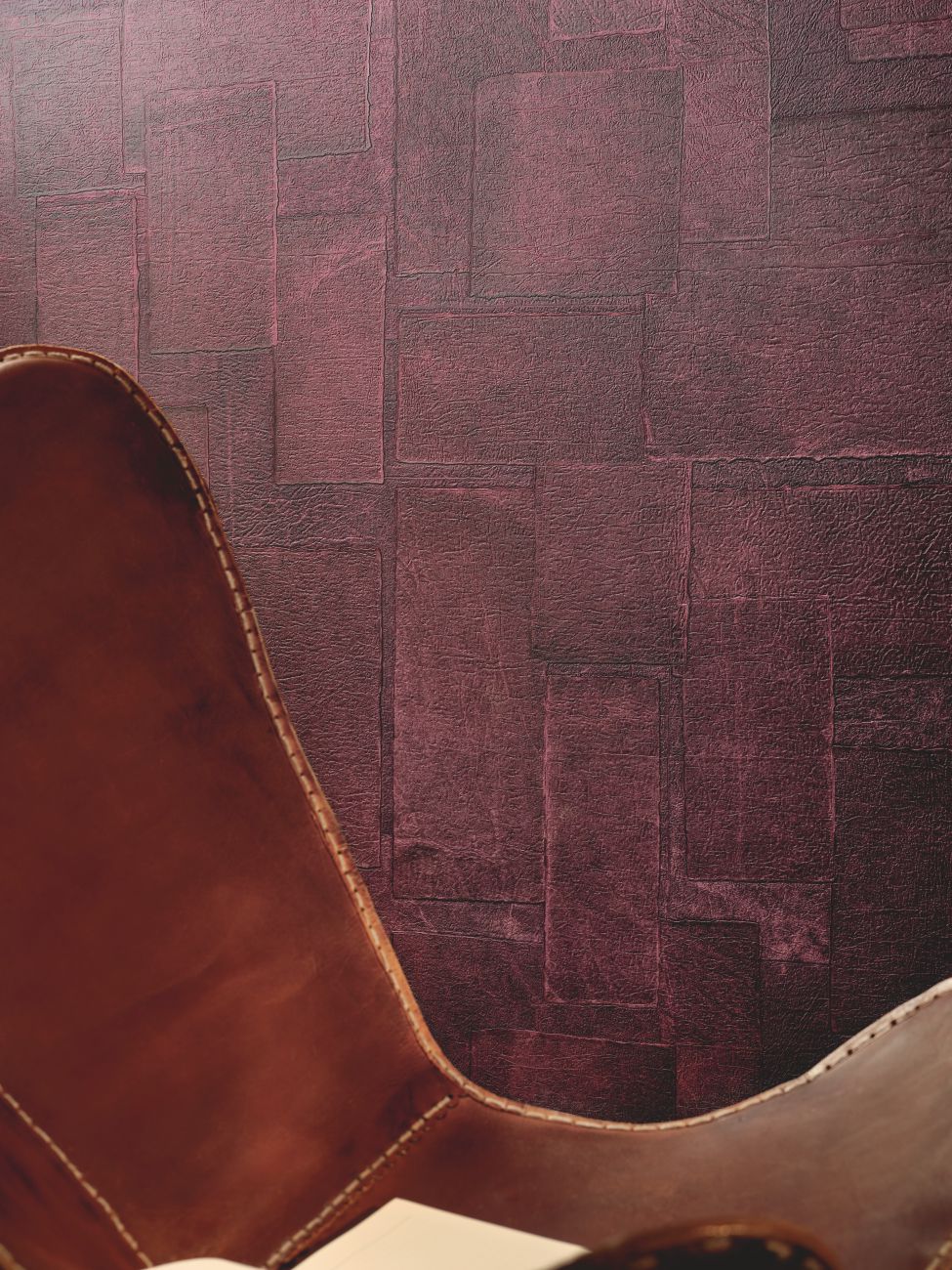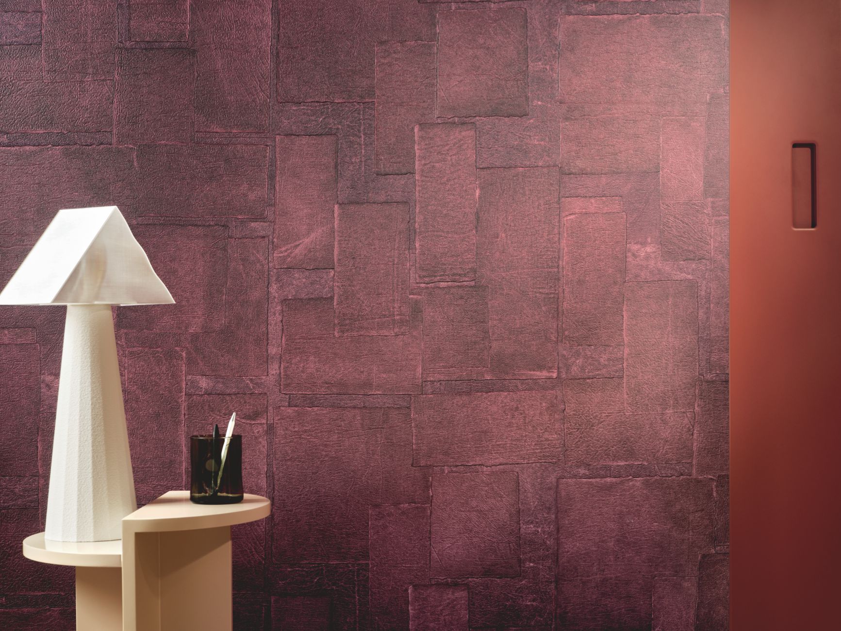 Beschreibung: Präge-Vinyl-Tapete mit der Optik von geklebten Papieren.