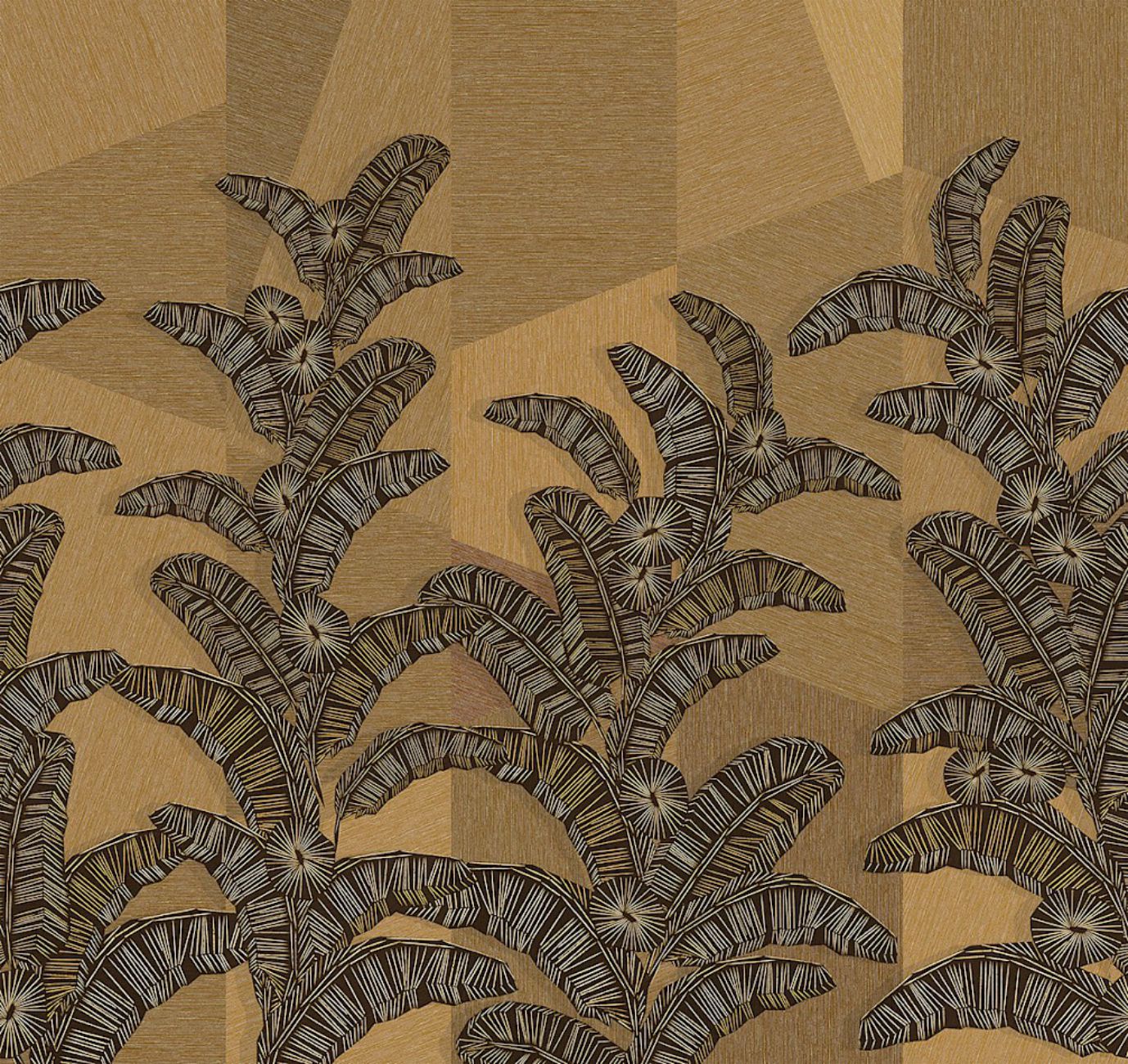Das Panorama-Design Yucatan beruht auf derselben Technik wie die Tapete Solana. Die Stäbe sind noch umfangreicher kombiniert, was zu einer größeren Fülle an Pflanzen führt. Die großen geometrischen Flächen in Sisal-Optik sorgen für eine angenehme Hintergrundstruktur.