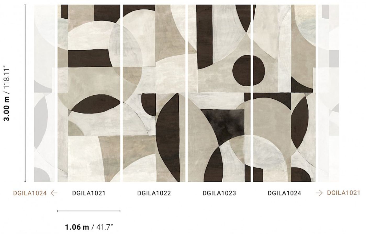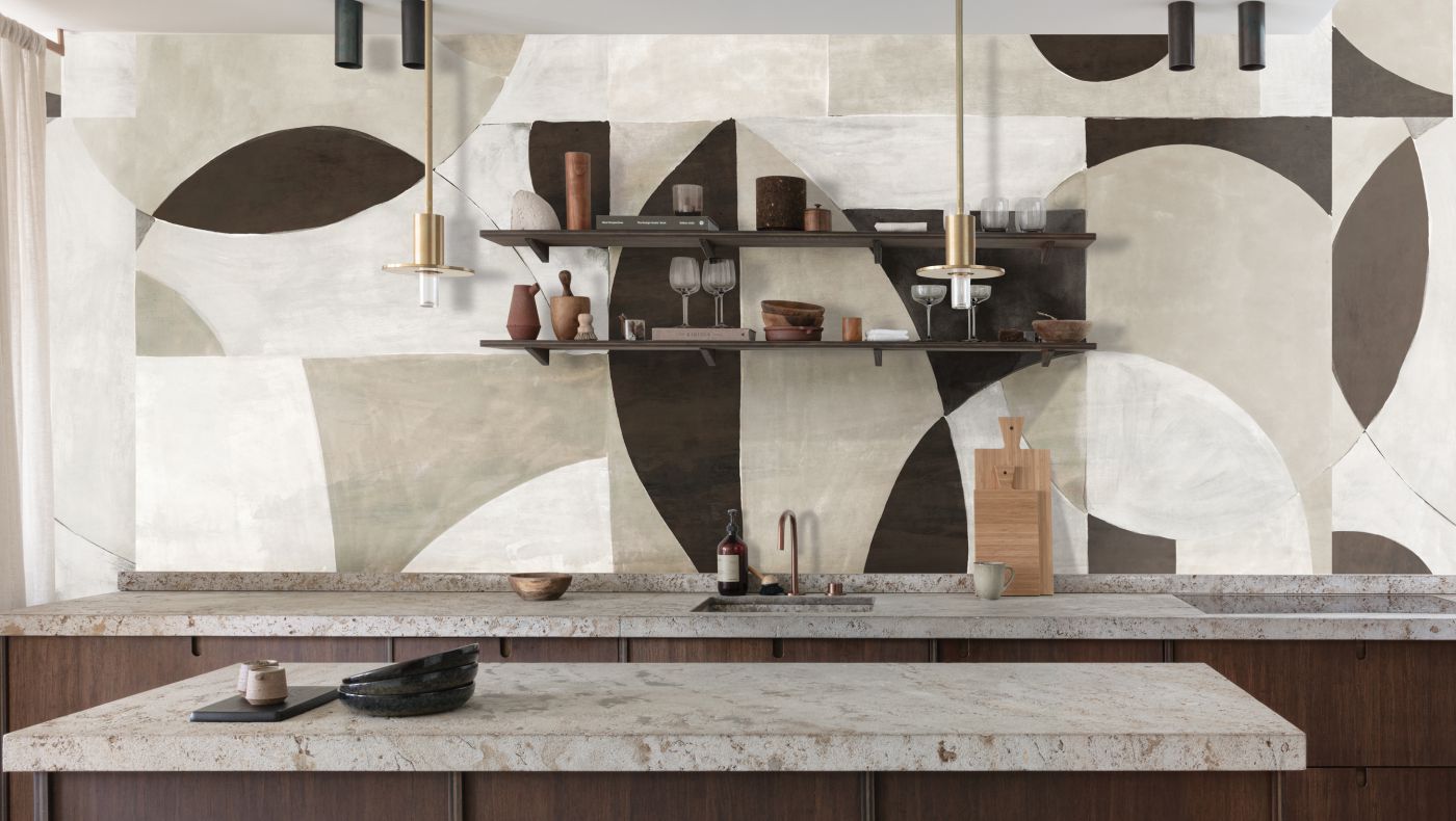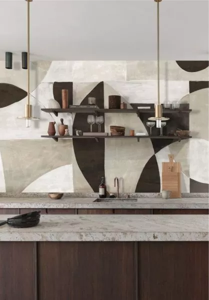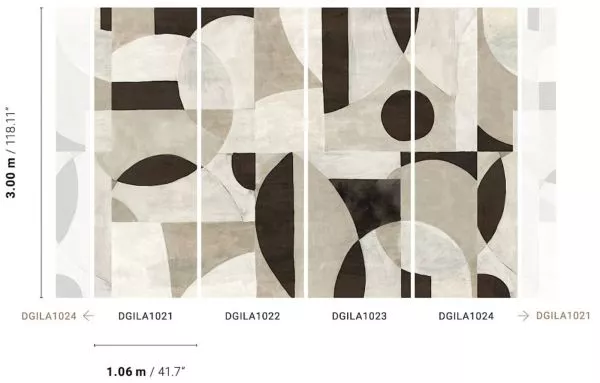 Noch einen Schritt weiter Richtung Abstraktion geht das Design Patina, das ein komplexes Gesamtbild verschiedener Farbflächen zeigt. Die Vergrößerung des Entwurfs ergibt ein schönes, großflächiges Ergebnis.
