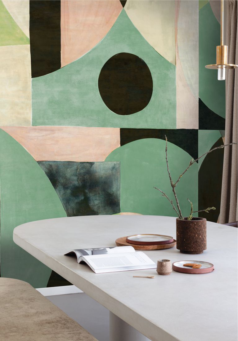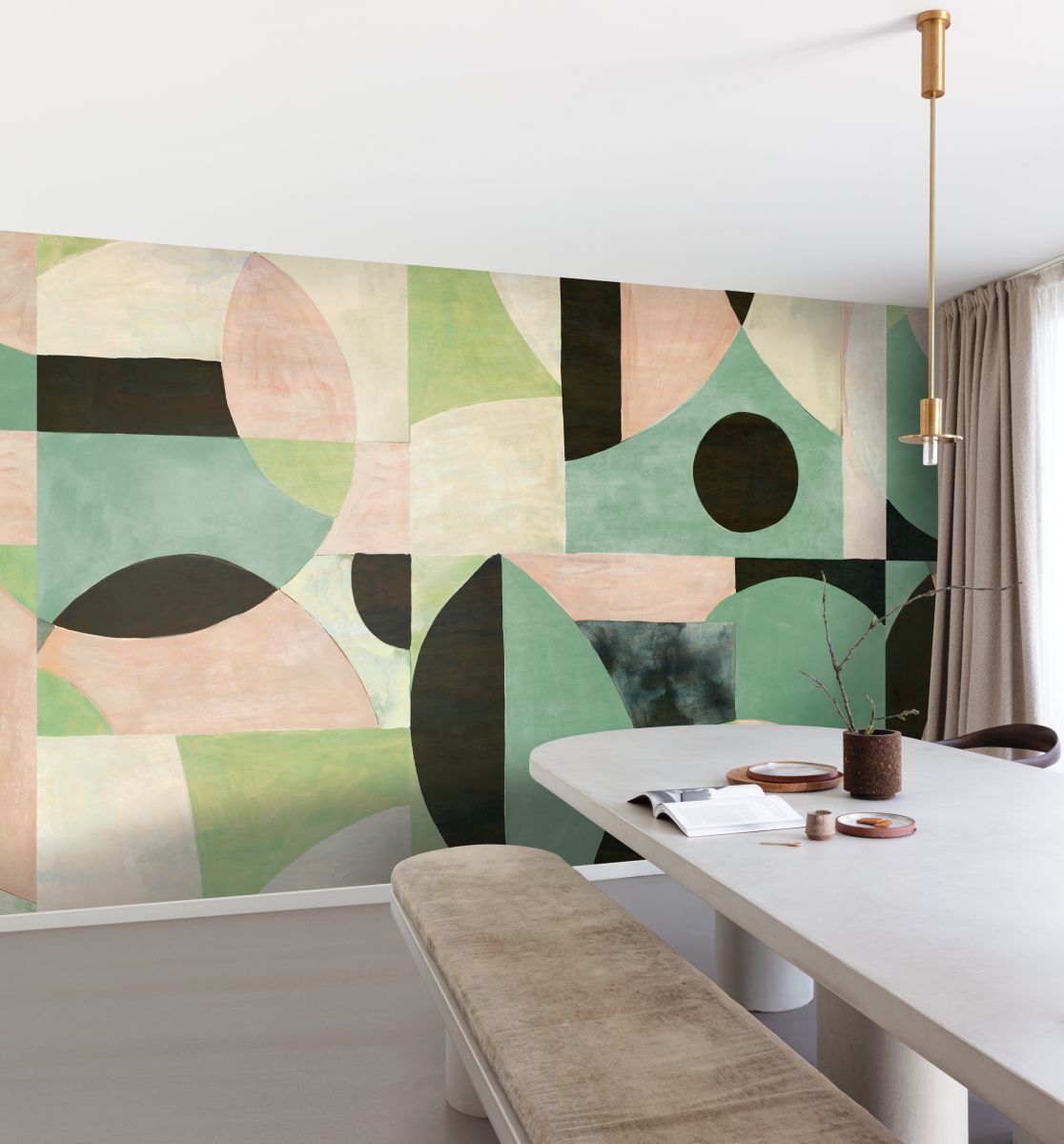 Noch einen Schritt weiter Richtung Abstraktion geht das Design Patina, das ein komplexes Gesamtbild verschiedener Farbflächen zeigt. Die Vergrößerung des Entwurfs ergibt ein schönes, großflächiges Ergebnis.