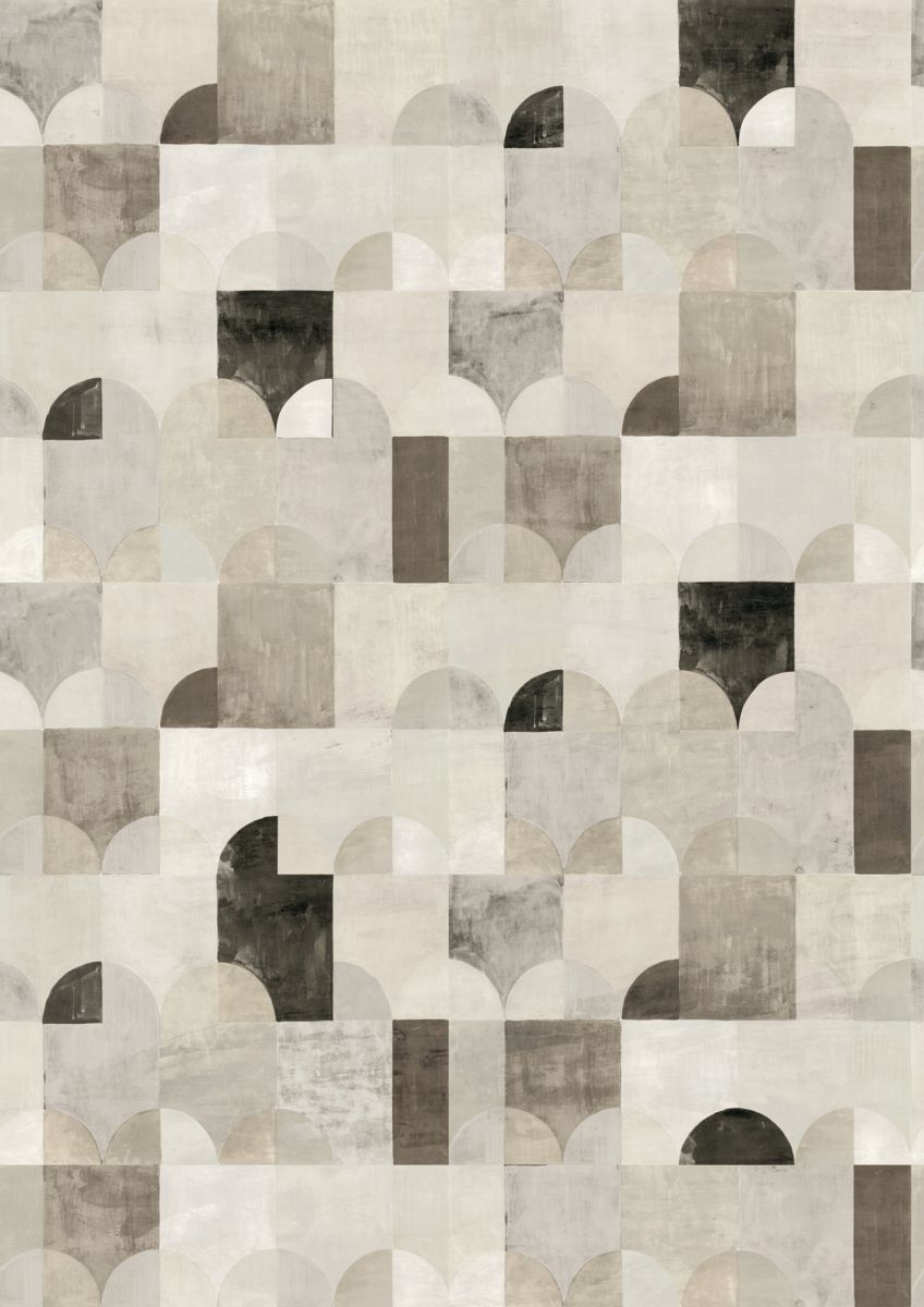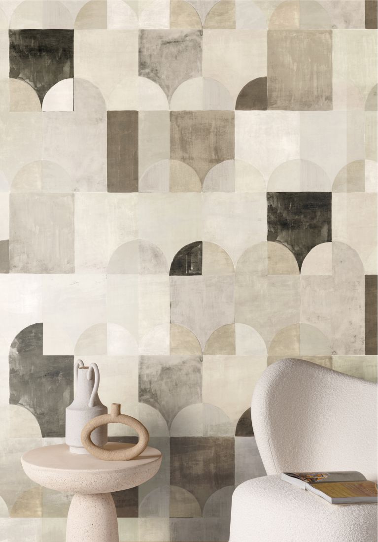 Die Tapete Arc ist von der Landschaft in Sobborgo inspiriert. Die Häuser und Bäume wurden zu einfachen Formen abstrahiert und bilden dank der vielen Farbkombinationen ein komplexes Ganzes.