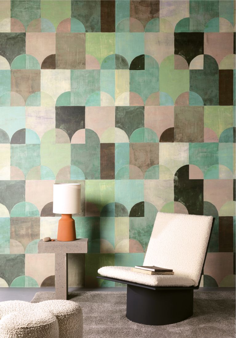 Die Tapete Arc ist von der Landschaft in Sobborgo inspiriert. Die Häuser und Bäume wurden zu einfachen Formen abstrahiert und bilden dank der vielen Farbkombinationen ein komplexes Ganzes.