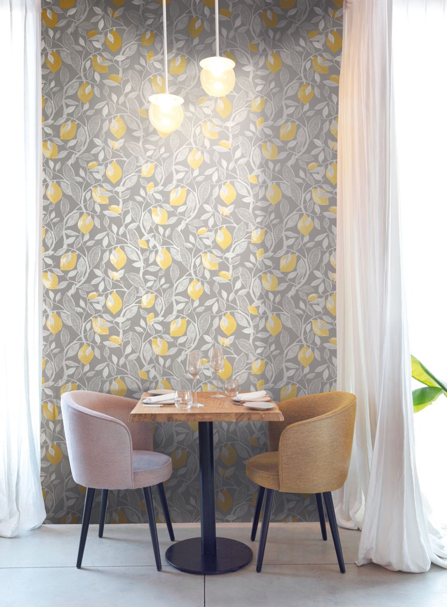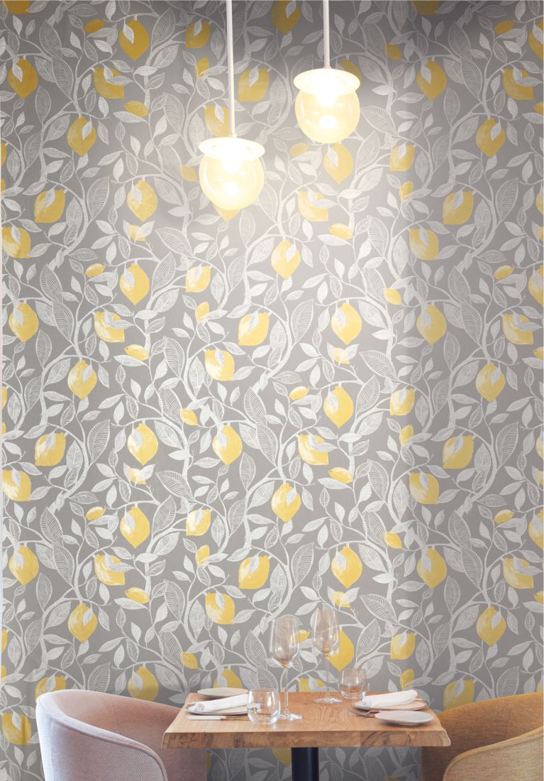 Ein Gewirr von Zweigen und Blättern, durchbrochen von leuchtenden Zitronen auf dunklem Grund. Limone ist ein einfaches, aber hochwertig verarbeitetes Design.